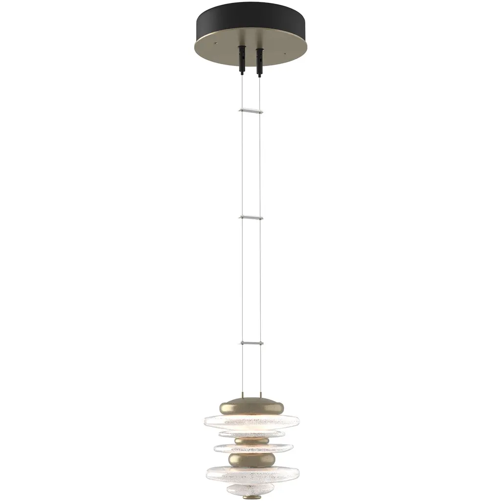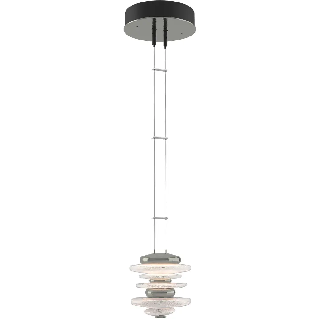 The Cairn LED Mini Pendant from Hubbardton Forge exudes delicate beauty and a calming presence. Its structure is made to look like a pile of stones gently stacked upon each other, but in reality, are made from thick hand-poured Glass and Cast-steel, supported by thin cables. Light is protruded downwards from the top, jumping over the Steel, giving the appearance of the Glass illuminating from within. Each part from this fixture is hand-crafted by skilled artisans in the United States.