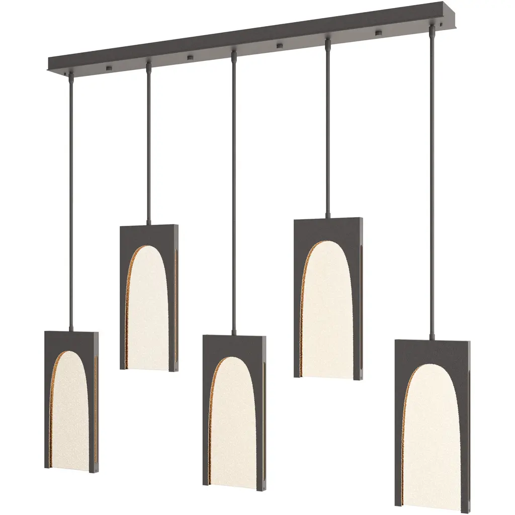 An addition to the Cairn Collection, this pendant tips the vertical glass "stone" stacks to a horizontal in this wonderful linear version. Round, textured clear and bubble glass of varying diameters are positioned side by side. Each of five "stacks" is bookended by metal, stone-shaped LED modules to great visual effect. Cable-hung, the Cairn Linear LED Pendant boasts a 4.7ft expanse, creating a stunning piece that is at home over a kitchen island, bar or reception counter, a dining table, a billiards table, and more.