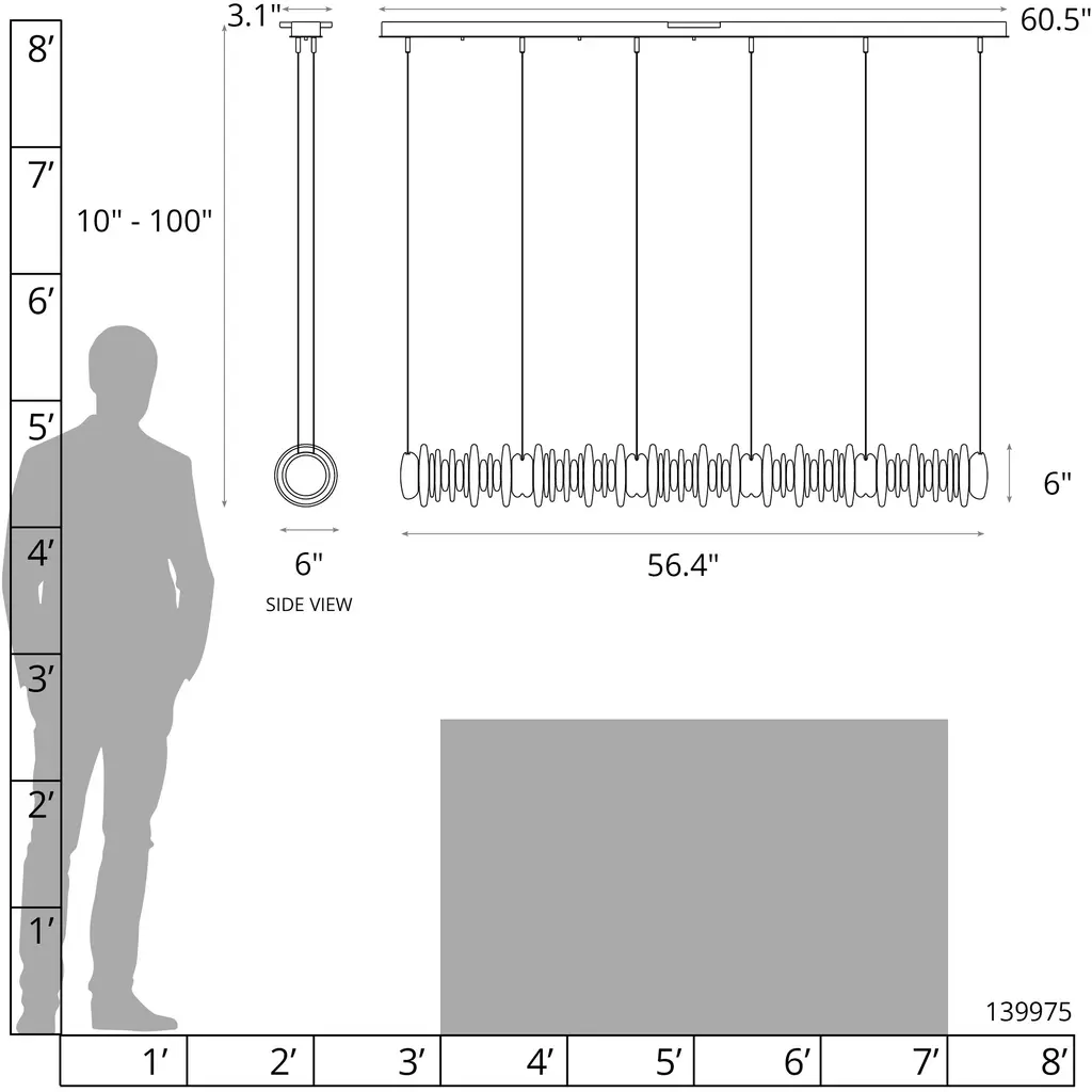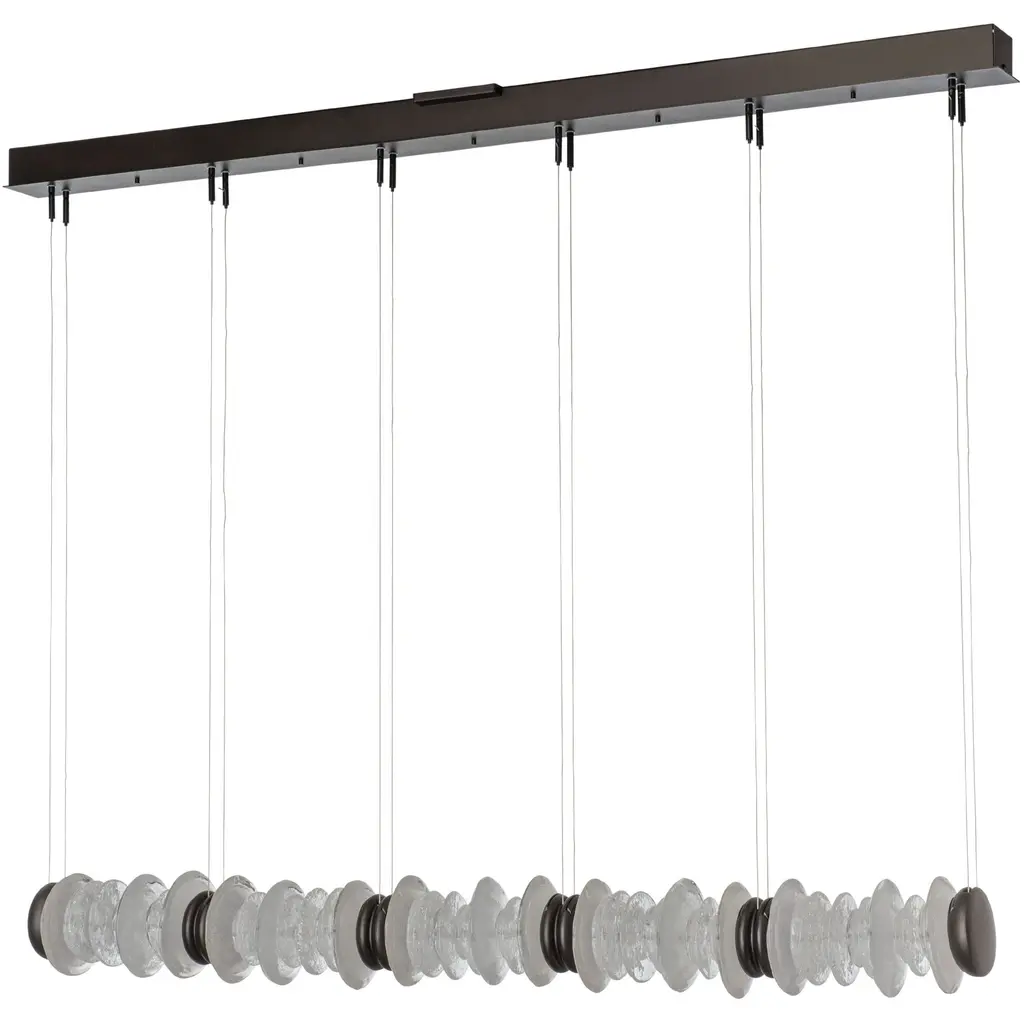 An addition to the Cairn Collection, this pendant tips the vertical glass "stone" stacks to a horizontal in this wonderful linear version. Round, textured clear and bubble glass of varying diameters are positioned side by side. Each of five "stacks" is bookended by metal, stone-shaped LED modules to great visual effect. Cable-hung, the Cairn Linear LED Pendant boasts a 4.7ft expanse, creating a stunning piece that is at home over a kitchen island, bar or reception counter, a dining table, a billiards table, and more.
