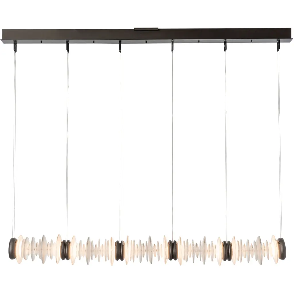 An addition to the Cairn Collection, this pendant tips the vertical glass "stone" stacks to a horizontal in this wonderful linear version. Round, textured clear and bubble glass of varying diameters are positioned side by side. Each of five "stacks" is bookended by metal, stone-shaped LED modules to great visual effect. Cable-hung, the Cairn Linear LED Pendant boasts a 4.7ft expanse, creating a stunning piece that is at home over a kitchen island, bar or reception counter, a dining table, a billiards table, and more.
