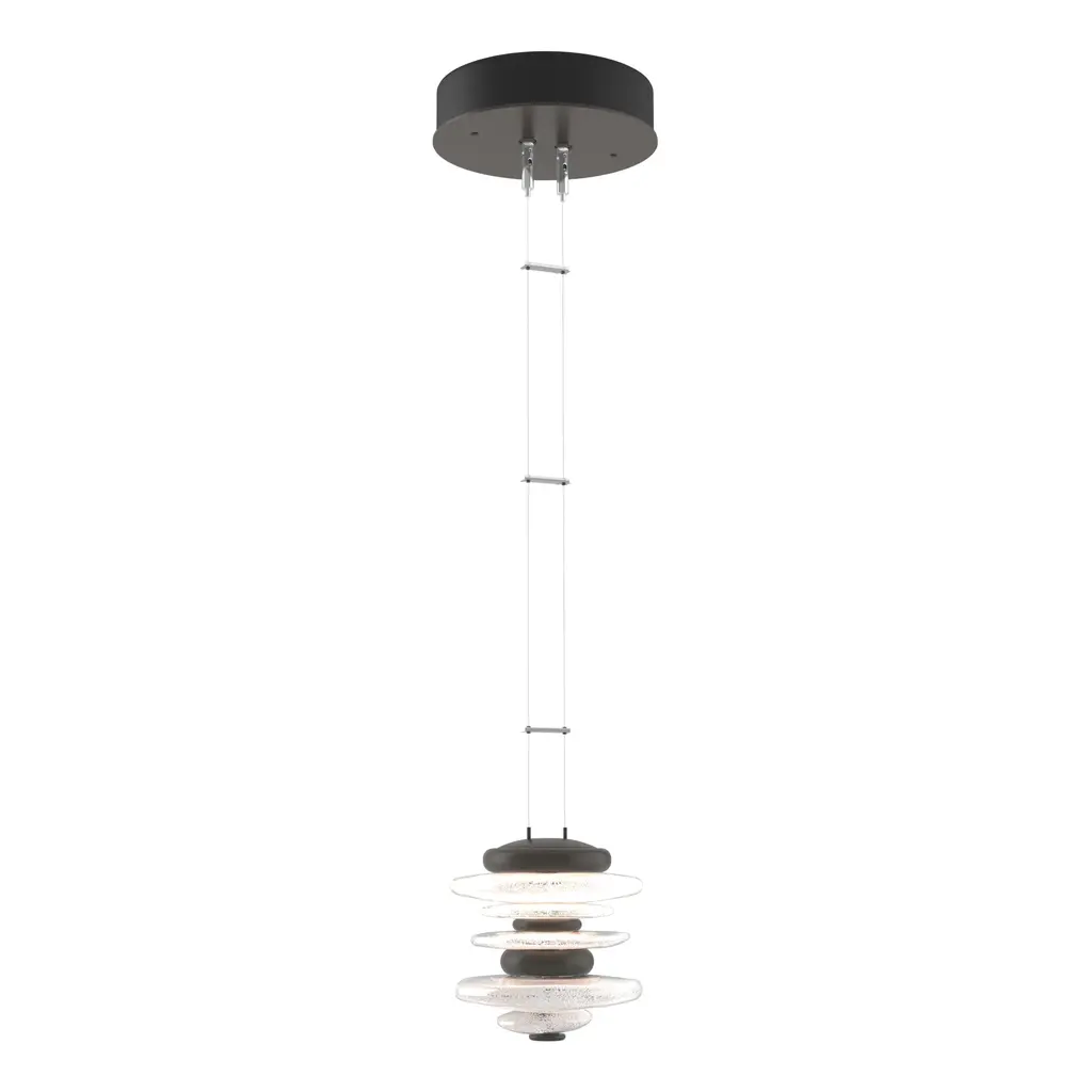 The Hubbardton Forge Cairn Pendant pays homage to the enigmatic stone sculptures, used since ancient times as landmarks. Thick hand-poured glass and cast steel “stones” are artistically stacked, and suspended by thin cables, creating a stunning illumination. Light flows over the steel and through the glass to seemingly glow from the inside. Adjustable cable-hung low-voltage LED mini pendant with glass and steel accents. Choose a finish for the decorative steel stones and the canopy faceplate. The upper canopy can will always be finished in black. Features