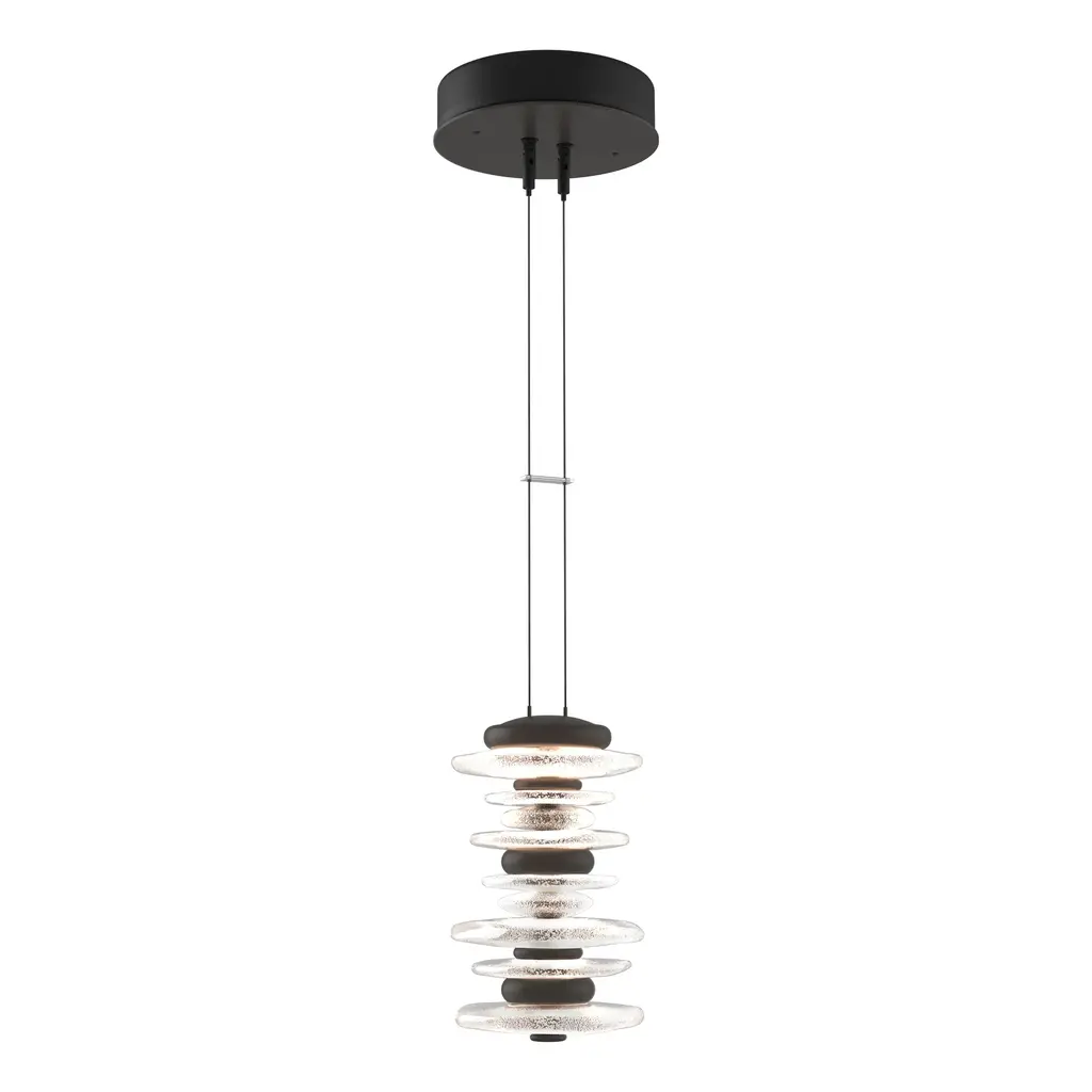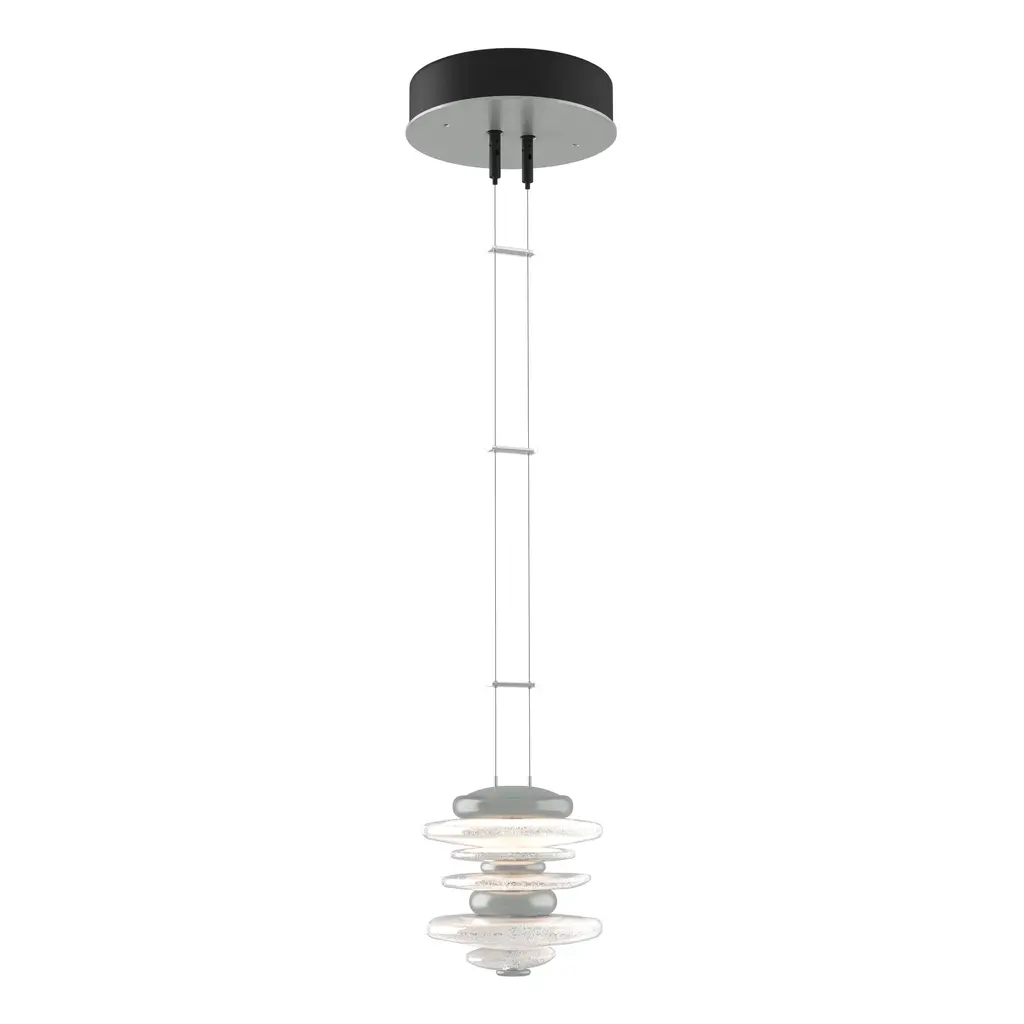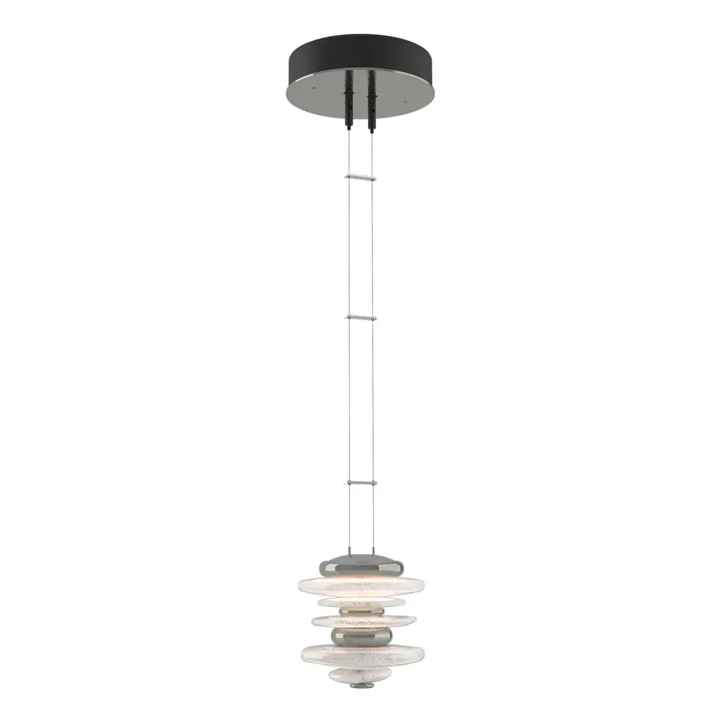The Hubbardton Forge Cairn Pendant pays homage to the enigmatic stone sculptures, used since ancient times as landmarks. Thick hand-poured glass and cast steel “stones” are artistically stacked, and suspended by thin cables, creating a stunning illumination. Light flows over the steel and through the glass to seemingly glow from the inside. Adjustable cable-hung low-voltage LED mini pendant with glass and steel accents. Choose a finish for the decorative steel stones and the canopy faceplate. The upper canopy can will always be finished in black. Features