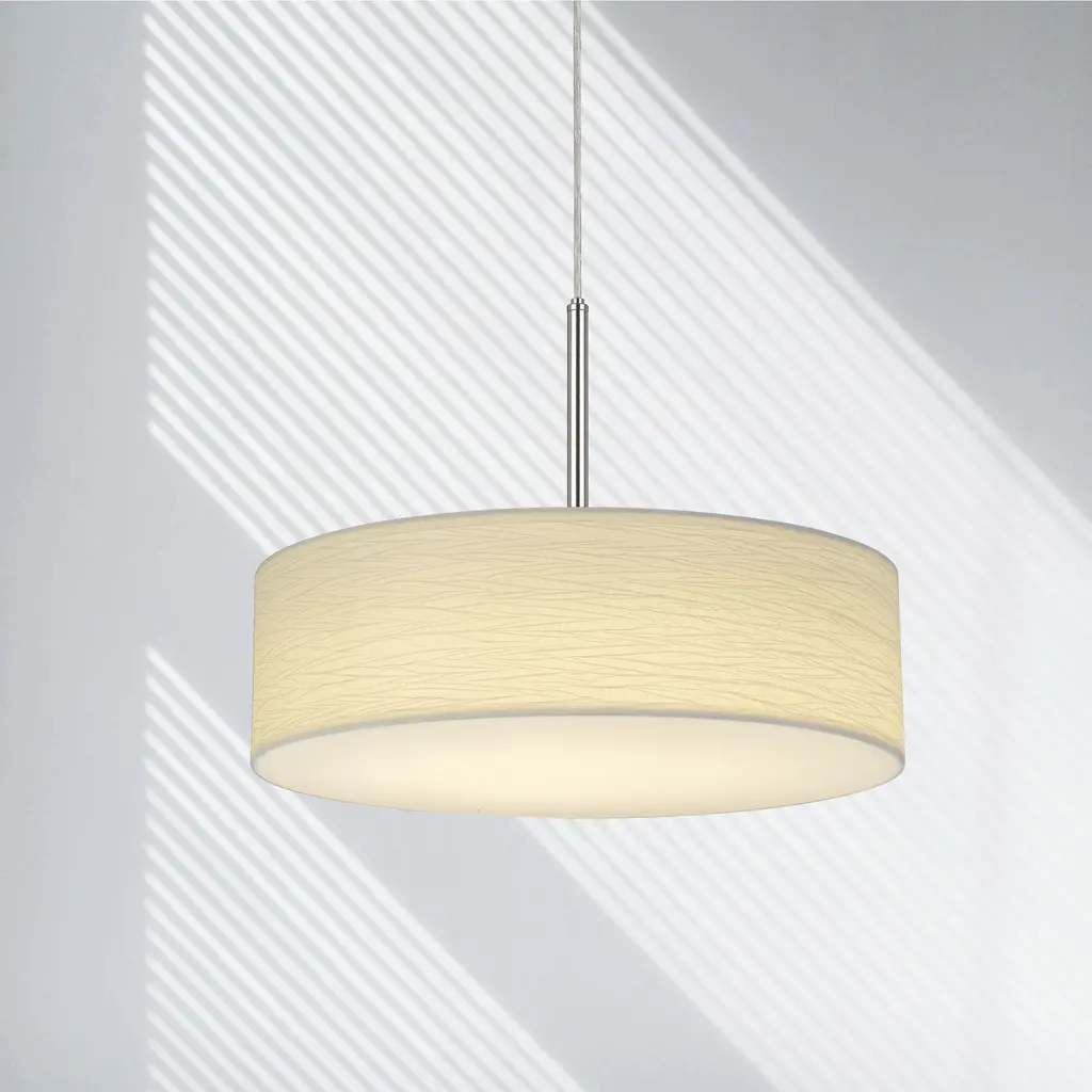 Update your space with this clean and simple led light fabric drum pendant. It ships complete with six feet of cord, acrylic diffuser and silver finish canopy plate. Its simple presentation makes it it a good fit with many different styles and décor.
