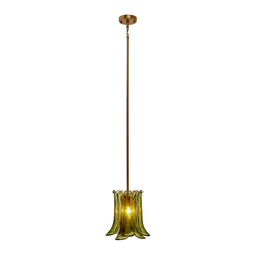 The shades of these artisan-crafted pendants were inspired by the fields of calla lilies that bloom wild in Big Sur. Featuring gracefully curved leaves in glass rimmed with a touch of metal, they hang from an adjustable antique brass rod and canopy. Traditionally hung above a table or kitchen island, they offer endless display options if you have vaulted ceilings! •Made of Mouth-Blown Glass•Adjustable Height: 12" to 53"•Antique Brass Hardware•Professional Installation Recommended•Compatible with Dimmer SwitchCrafted of hand-blown glass, this fixture will feature subtle markings and variations in tone. These unique imperfections and variations are what define our products, with each piece having its own personality. •Canopy Dimensions: 1"H x 4.75"Dia, Antique Brass• Glass Piece Dimensions: 11"H x 3.25"W x 3.75'D• 1 bulb (A19) required; Bulb not included• 60 Max Wattage; 120 Volts • E26 Bulb Base Type• Hardwired• Antique Brass Rods;: Two 15.75" Rods, One 7.75" Rod• Does not hang on sloped ceilings• Fixture Body Height: 12"• Not Damp Rated Wipe clean using a soft, dry cloth or static duster. Avoid using harsh or abrasive cleaners as they can damage product. Do not exceed specified wattage.