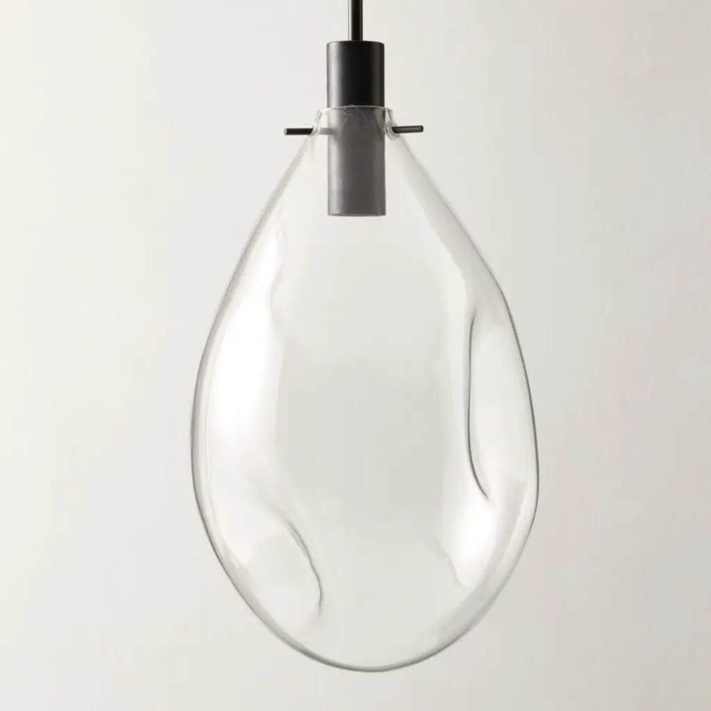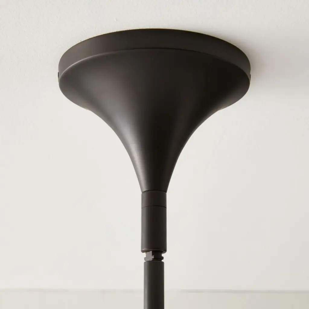 Designed by Farrah Sit, pendant light gleams overhead with an elegant mixed-material look. Encased by a blown-glass shade, the pendant is suspended from a slim, polished blackened brass rod, giving the appearance that the fixture is floating from the ceiling. Housed within Marquina black marble, the bulb emits a warm glow that highlights the beauty of the stone. CB2 exclusive.