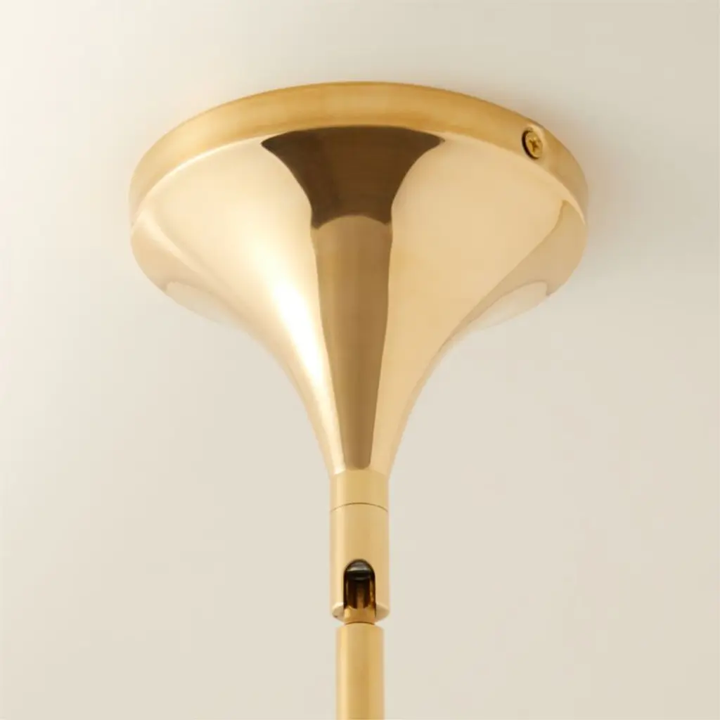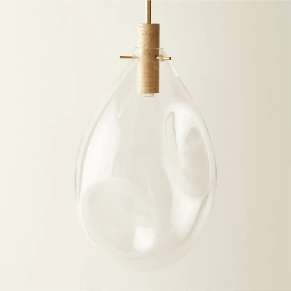 Designed by Farrah Sit, pendant light gleams overhead with an elegant mixed-material look. Encased by a blown-glass shade, the pendant is suspended from a slim, polished brass rod, giving the appearance that the fixture is floating from the ceiling. Housed within unfilled travertine, the bulb emits a warm glow through the stone's natural pitting. Brass is unlacquered, offering a living finish that will develop the patina of a vintage find. CB2 exclusive.Due to the nature of the material, brass patina will vary in color and darken over time.