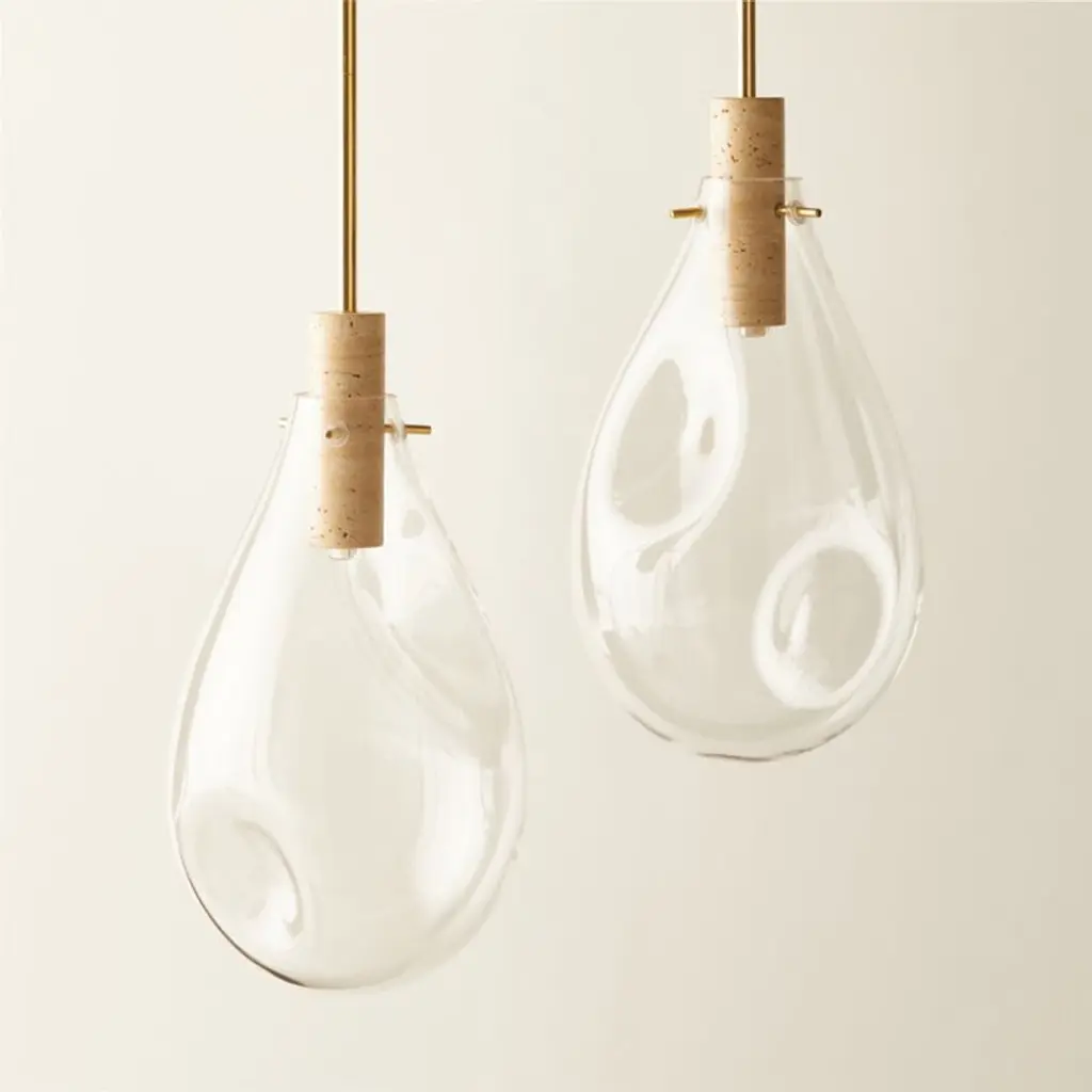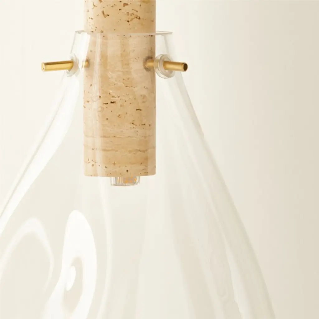 Designed by Farrah Sit, pendant light gleams overhead with an elegant mixed-material look. Encased by a blown-glass shade, the pendant is suspended from a slim, polished brass rod, giving the appearance that the fixture is floating from the ceiling. Housed within unfilled travertine, the bulb emits a warm glow through the stone's natural pitting. Brass is unlacquered, offering a living finish that will develop the patina of a vintage find. CB2 exclusive.Due to the nature of the material, brass patina will vary in color and darken over time.