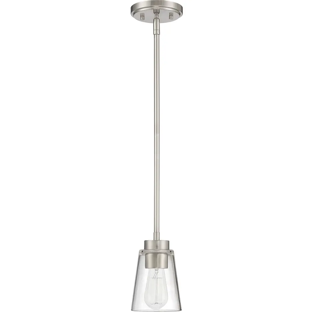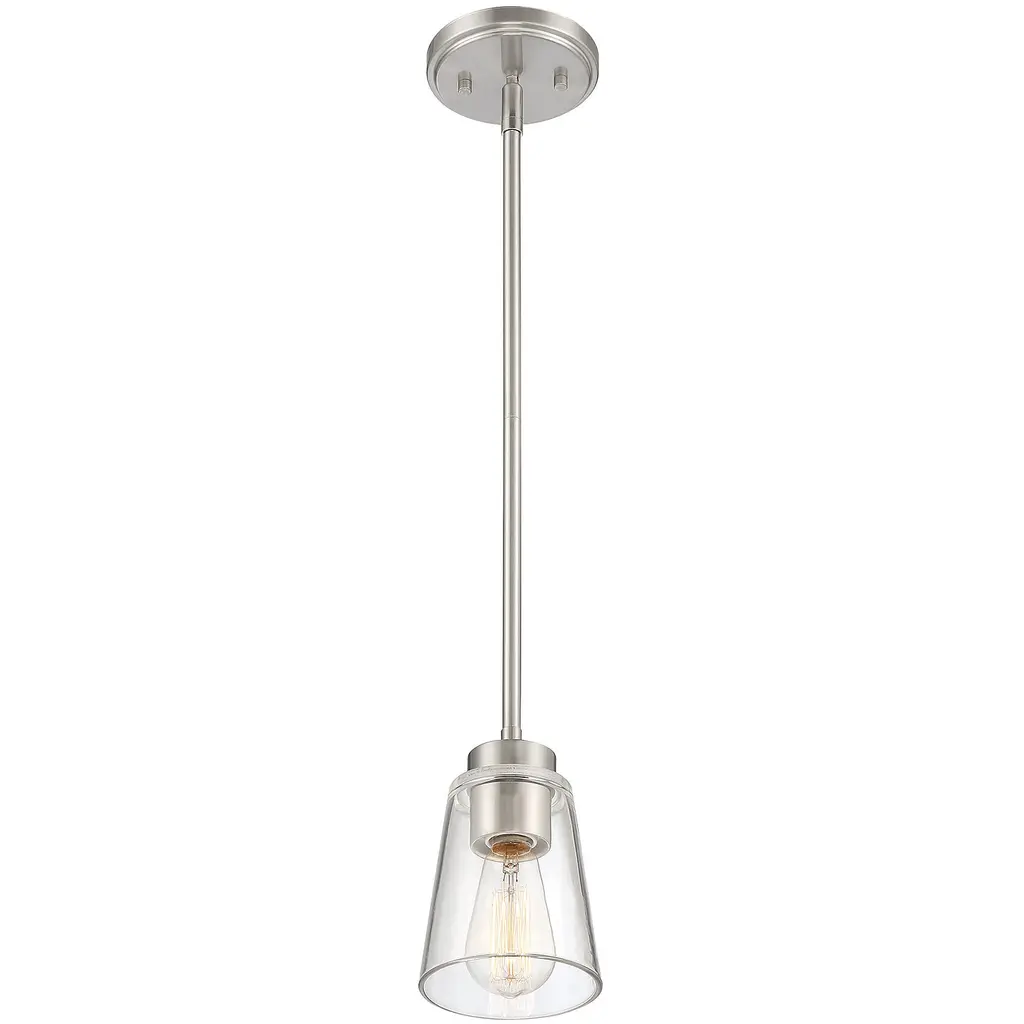 The Calhoun collection is distinguished by simple lines that can easily enhance transitional and contemporary decor. With an adjustable height from 16.5" to 35.5" and measuring 5" wide, this one-light small mini pendant offers a clean silhouette in a satin nickel finish and clear glass shade. It is illuminated by one 60-watt standard size bulb.
