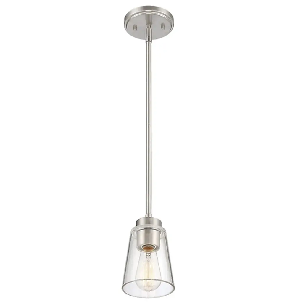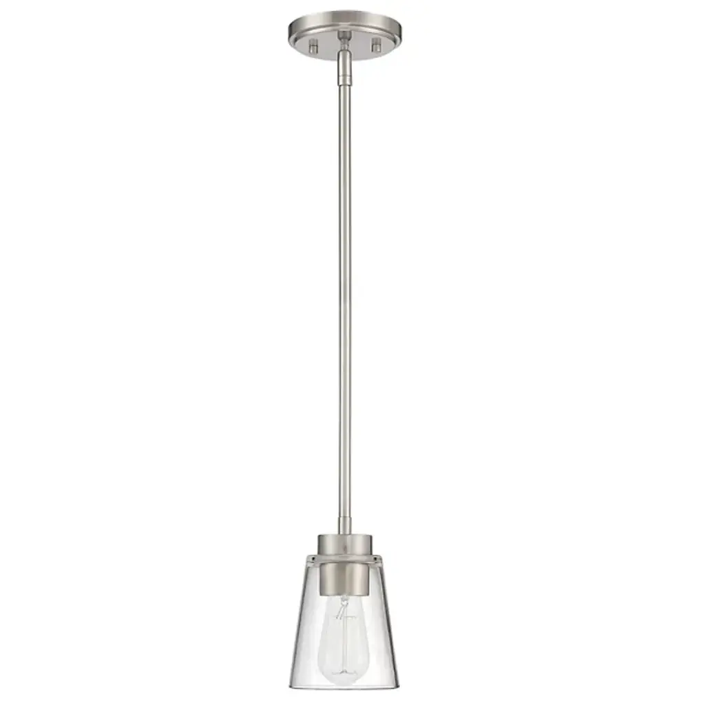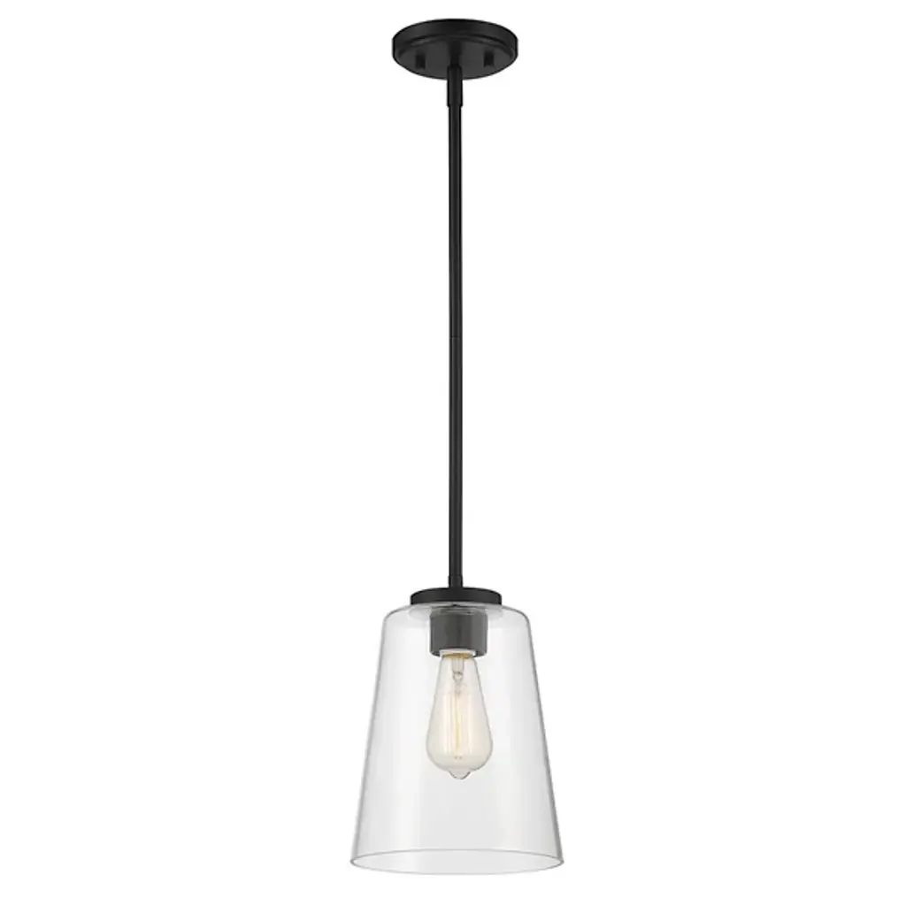 The Calhoun Mini Pendant by Savoy House has a clean, contemporary look. With simple lines, a sleek downrod and round canopy support this mini pendant, holding a slightly tapered, clear glass shade that a single, visible bulb is housed within. Offering a bright touch to modern spaces, a beautiful finish dresses up the metal elements of this design, allowing it to complement a wide range of spaces and décor styles.