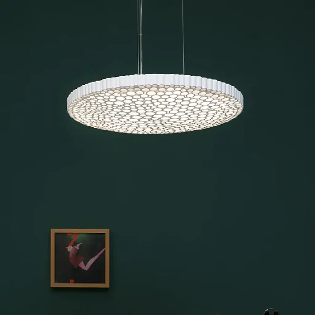 A satellite-inspired lighting floating mid-air over dining hall or kitchen island. The Calipso Pendant by Artemide features a honeycomb-like structure with fluted sides and multiple openings. It was made by feeding a photo of the moon into an image-based algorithm composed of cylinders that resemble a honeycomb surface. Within each cylinder is a diffuser concealing an LED light source that delivers a soft glow. Suspended from a rectangular ceiling canopy via slim cords, this fixture brings an ultra-modern twist to your home.