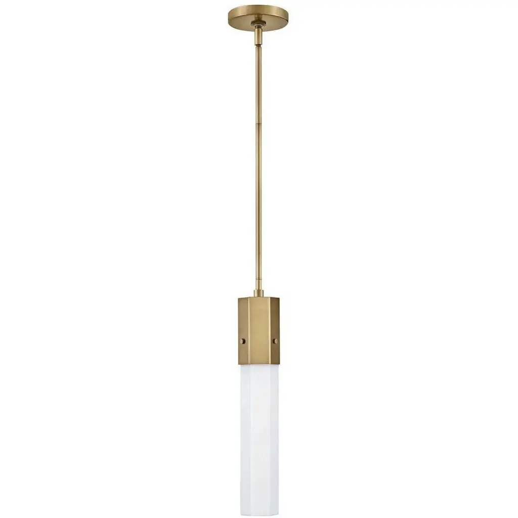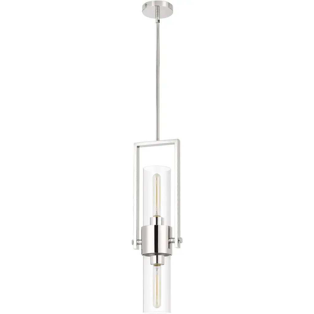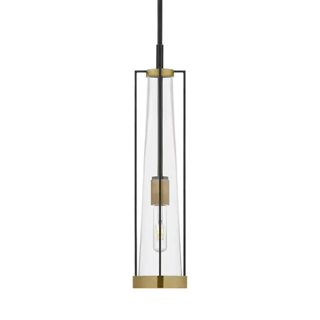 Sleek and eye-catching, the Calix Mini Pendant from Visual Comfort Signature, formerly known as Visual Comfort, brings a tasteful display of clean, ordered geometry that stands out in a range of home decors. A simple, unassuming disc-shaped ceiling mount and a thin downrod uphold the body of the piece, which is formed from a circular pendant that extends a clear glass shade and four evenly-spaced wires that neatly frame the body. Within the shade is a single bulb that hangs delicately, shining a warm glow that diffuses slightly through the glass and into the space.