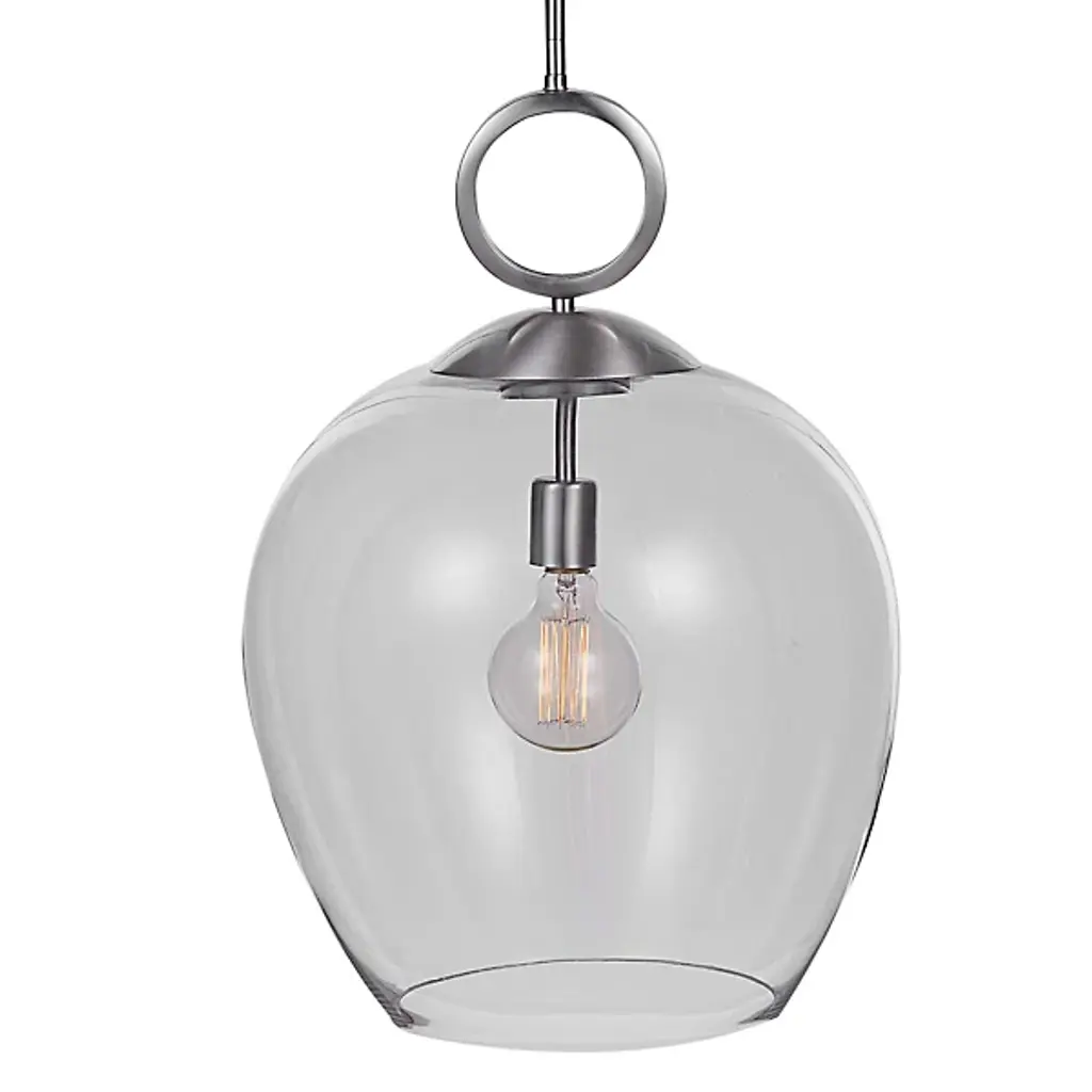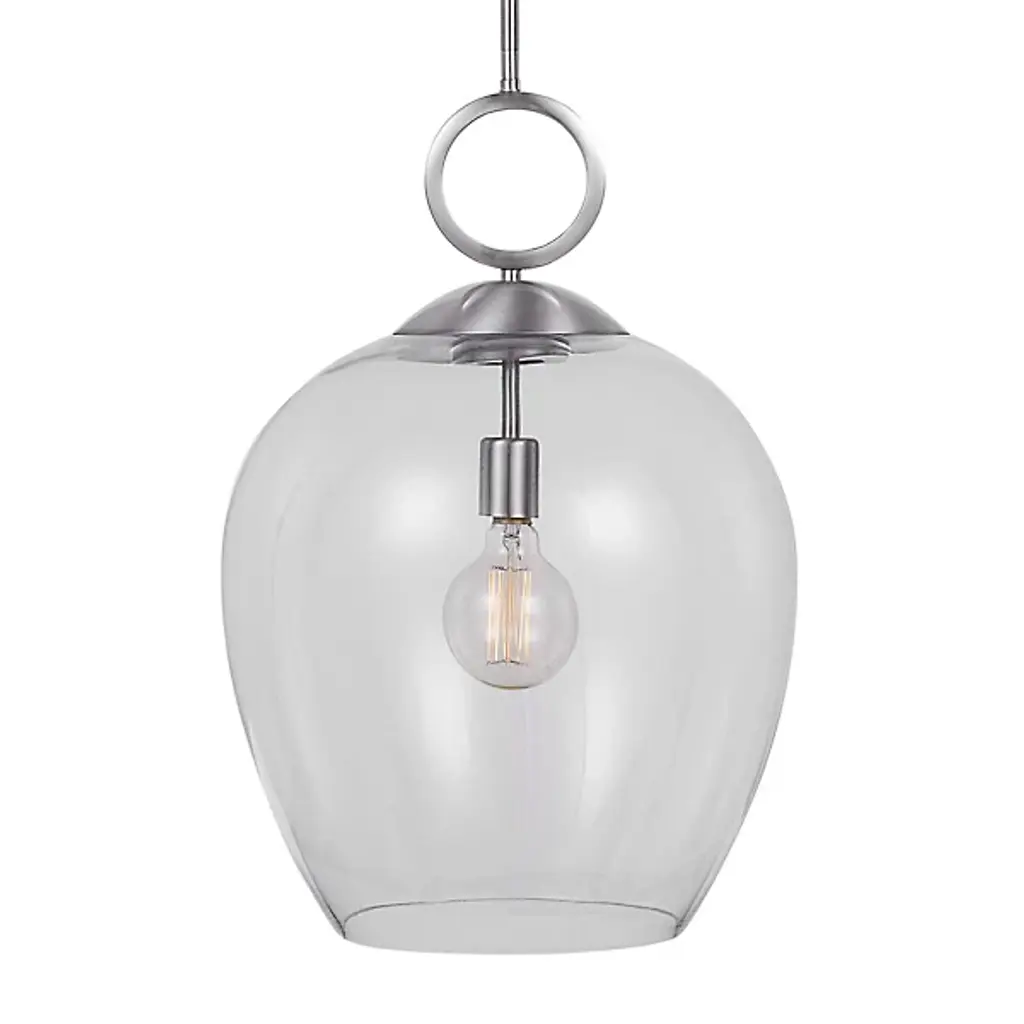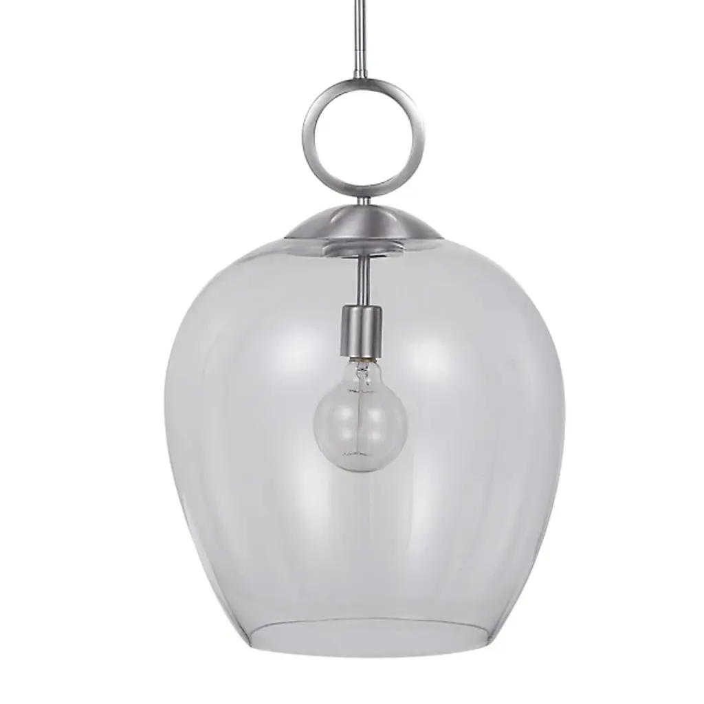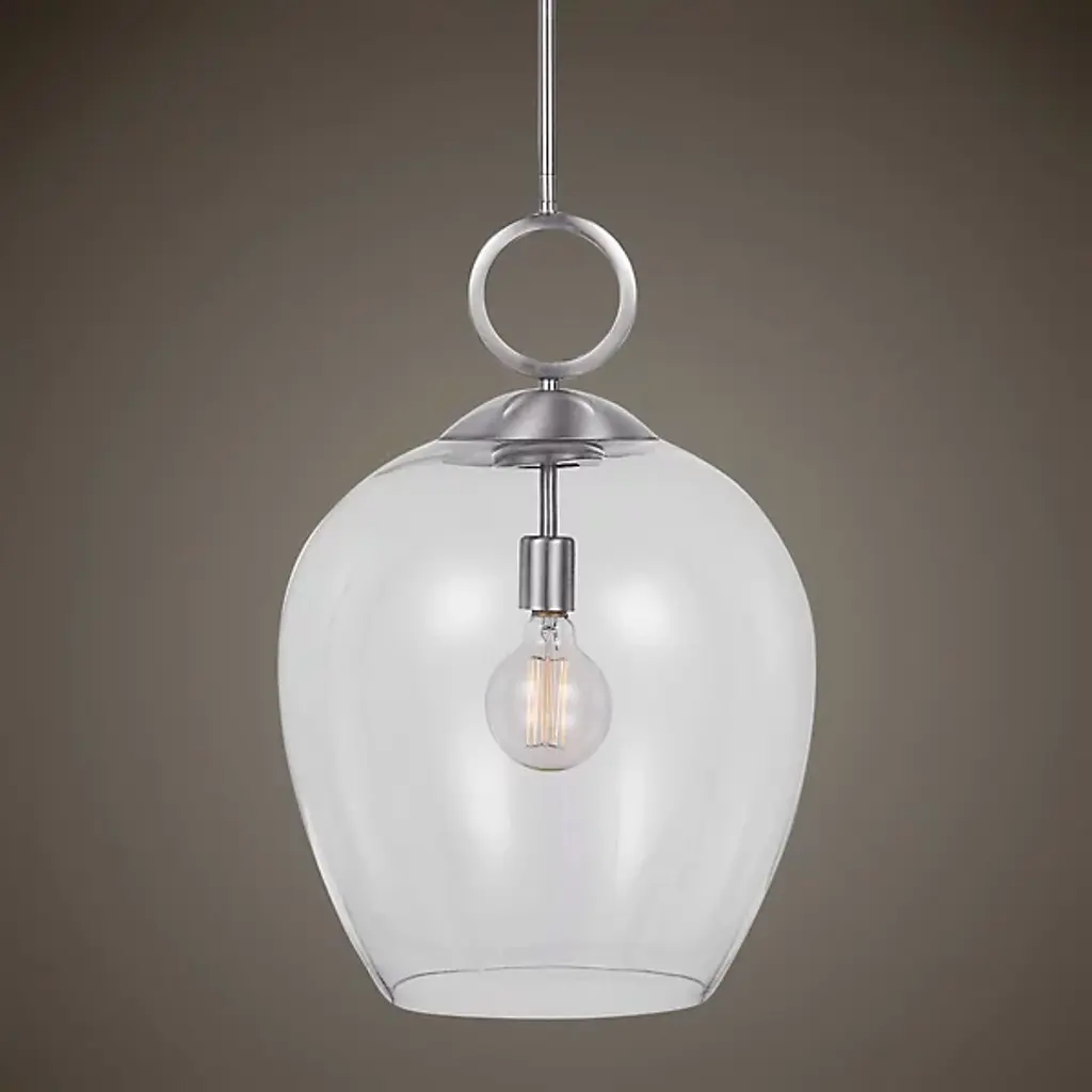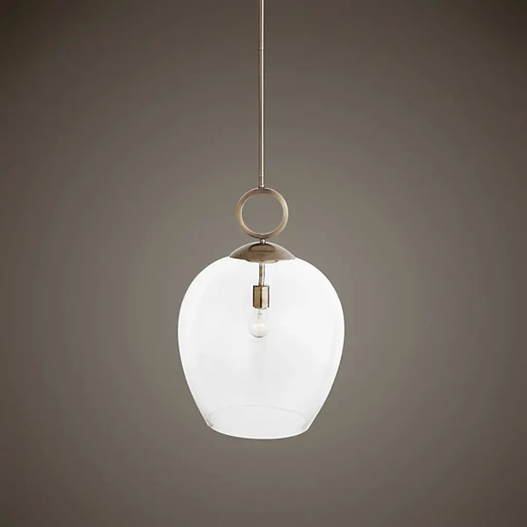 Refined elegance for the transitionally-minded. The Calix Pendant by Uttermost shimmers beautifully from any angle, characterized by a large clear blown glass shade that reflects the light source in a relaxing manner. Its aged brass metal finish is also aesthetically-pleasing, creating a captivating ombre effect to complement the soft illumination. Hang this pendant above a dining table and an inviting presence will emerge.