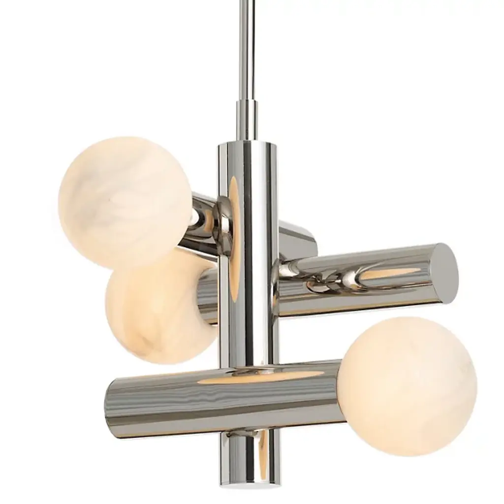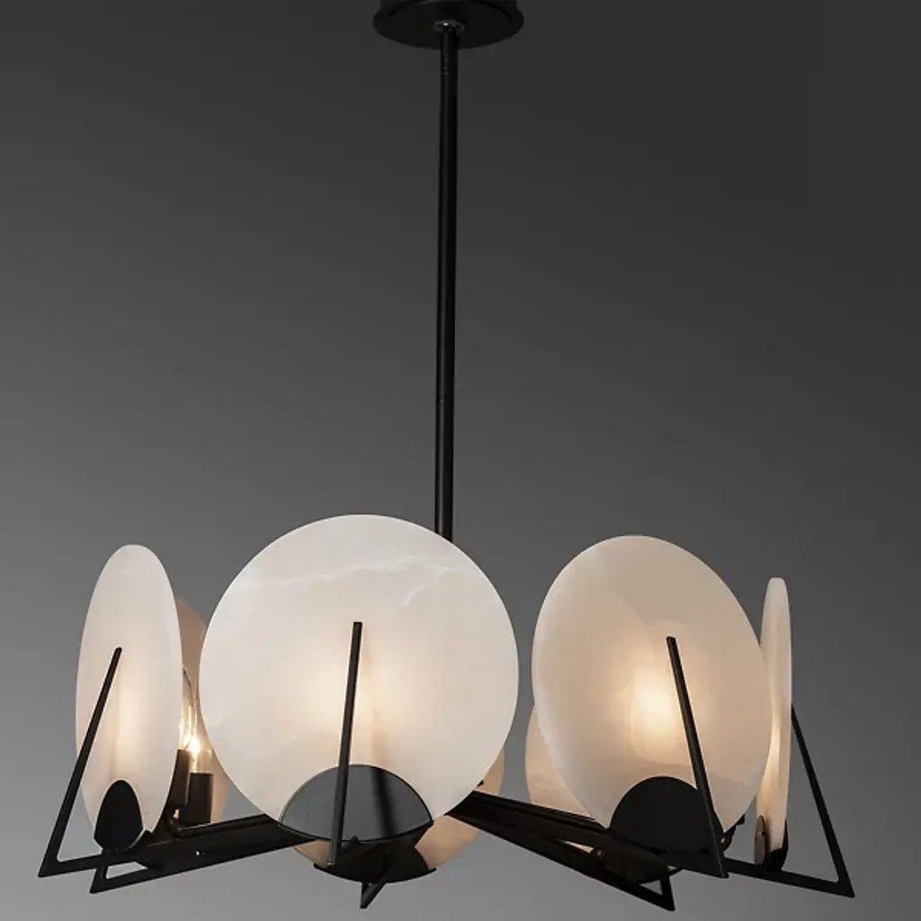 An elegant and textural design only natural materials and fine craftsmanship can provide. Designed by Ori Goldberg, the Callisto 7-Light Pendant by Hubbardton Forge uses discs of genuine alabaster as the shades in front of their respective light bulbs. Their soft shape and the soft ambient light they produce contrast beautifully with the sharp angles of the hand-forged steel frame. The unique texture of the stone really comes to life when the pendant is turned on over a dining table or large kitchen island.