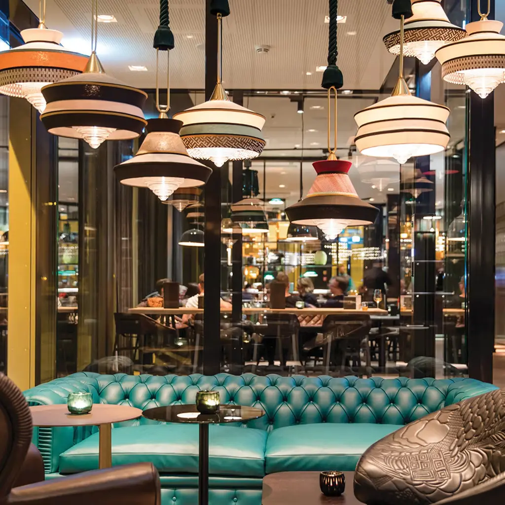 Calypso is a collection of suspensions inspired by the art deco period, with fabrics whose textures and white and black geometric patterns mix with bright colors of South American and tropical culture, providing a very original result. The indoor version is characterized by a green braided silk rope. The metal support is a satin brass finished ring. The diffuser is in transparent glass.