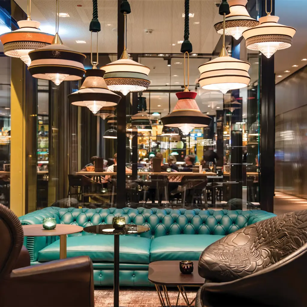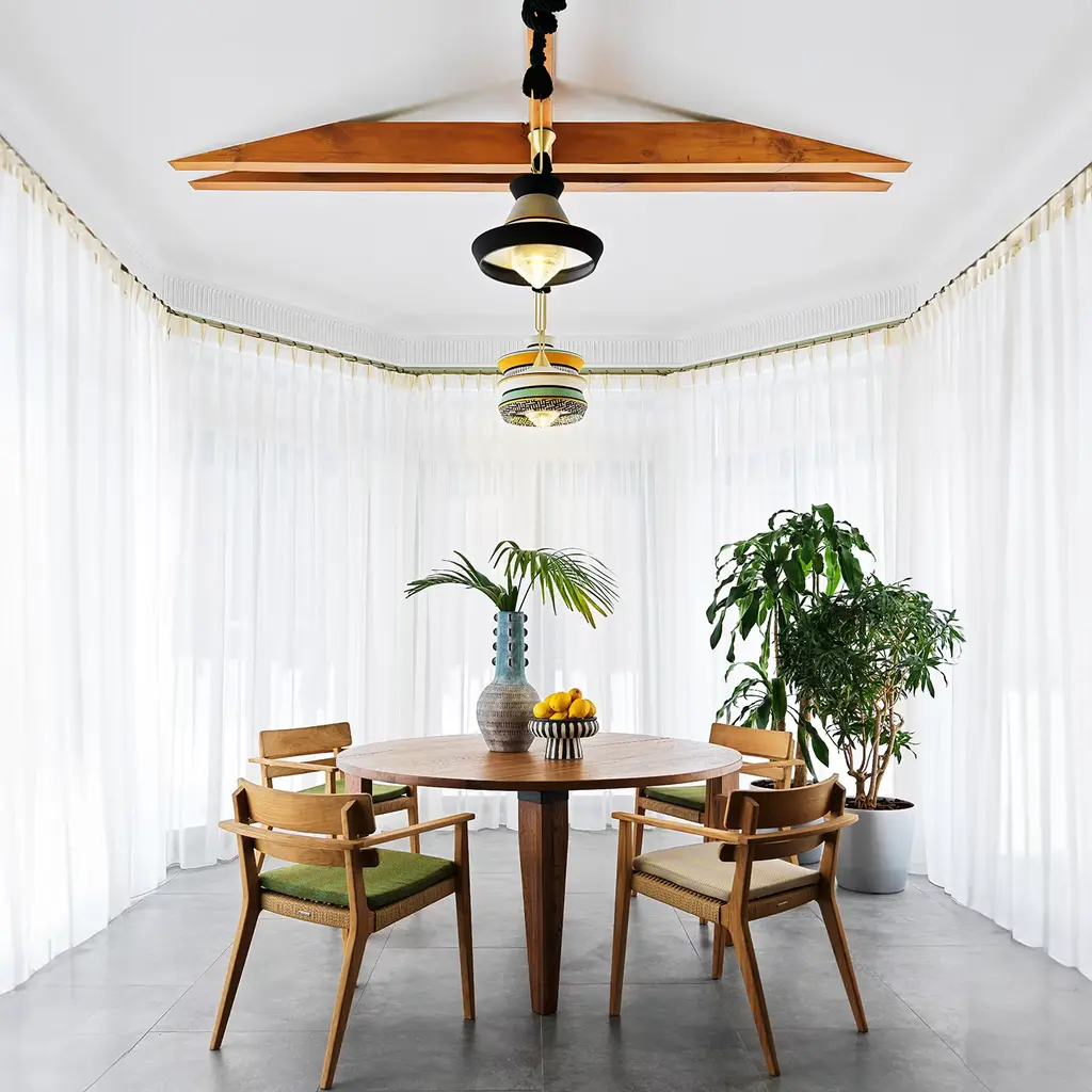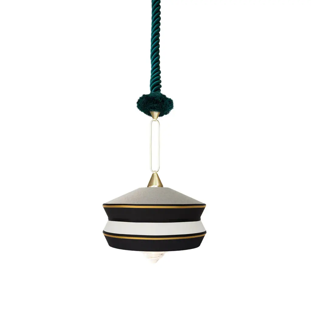 Calypso is a collection of suspensions inspired by the art deco period, with fabrics whose textures and white and black\ngeometric patterns mix with bright colors of South American and tropical culture, providing a very original result. The indoor\nversion is characterized by a green braided silk rope. The metal support is a satin brass finished ring. The diffuser is in\ntransparent glass.