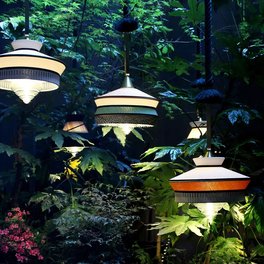 Calypso outdoor is a product with IP65 protection degree, therefore a real Outdoor. Waterproof and fireproof fabrics are suitable to withstand atmospheric agents at particularly high or low temperatures while maintaining the colors and the craftsmanship quality of the product. The electric cables pass through the green-colored marine rope and the supporting frame, which is made of a smoothed solid piece in satin brass finish. The light source is housed inside a glass cylinder that is sealed to guarantee the IP65 degree of protection. The diffuser is in transparent glass. Light source: 1 X E27 T8 Tubular LED bulb ip65.