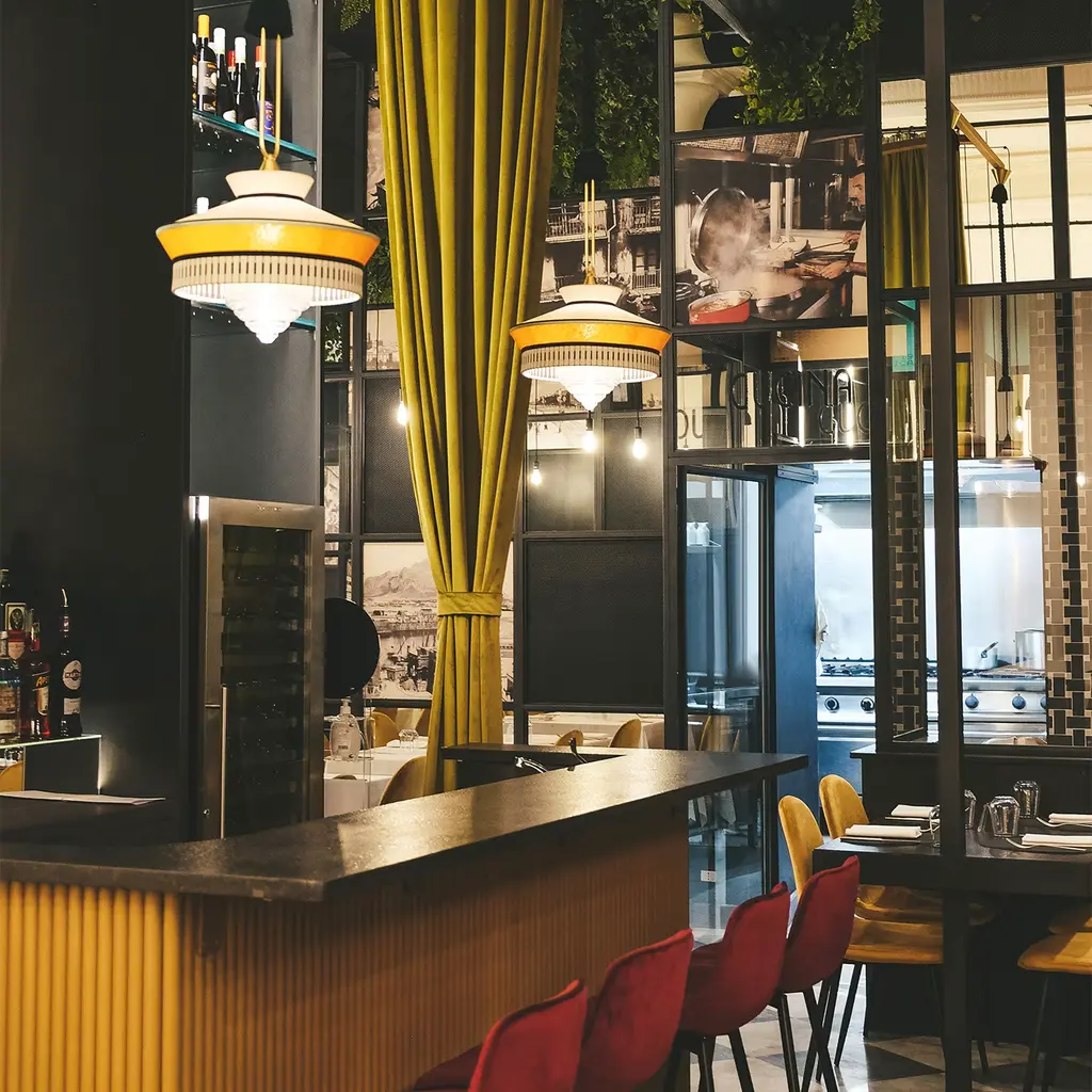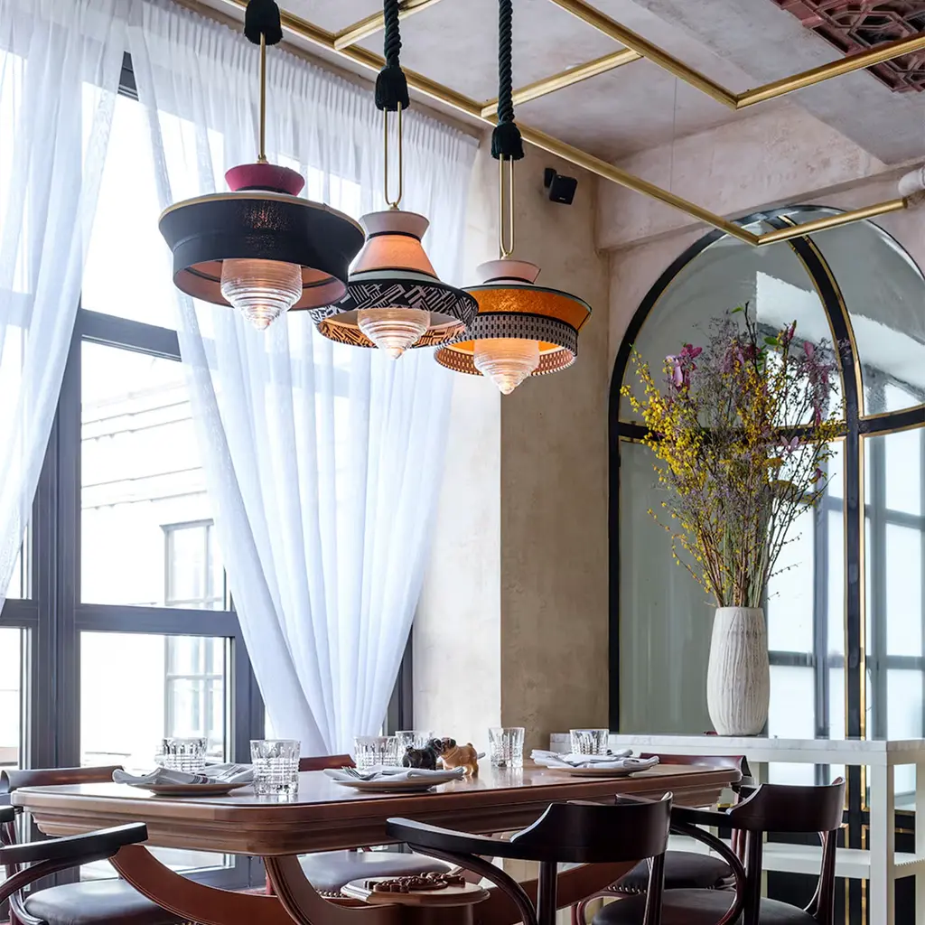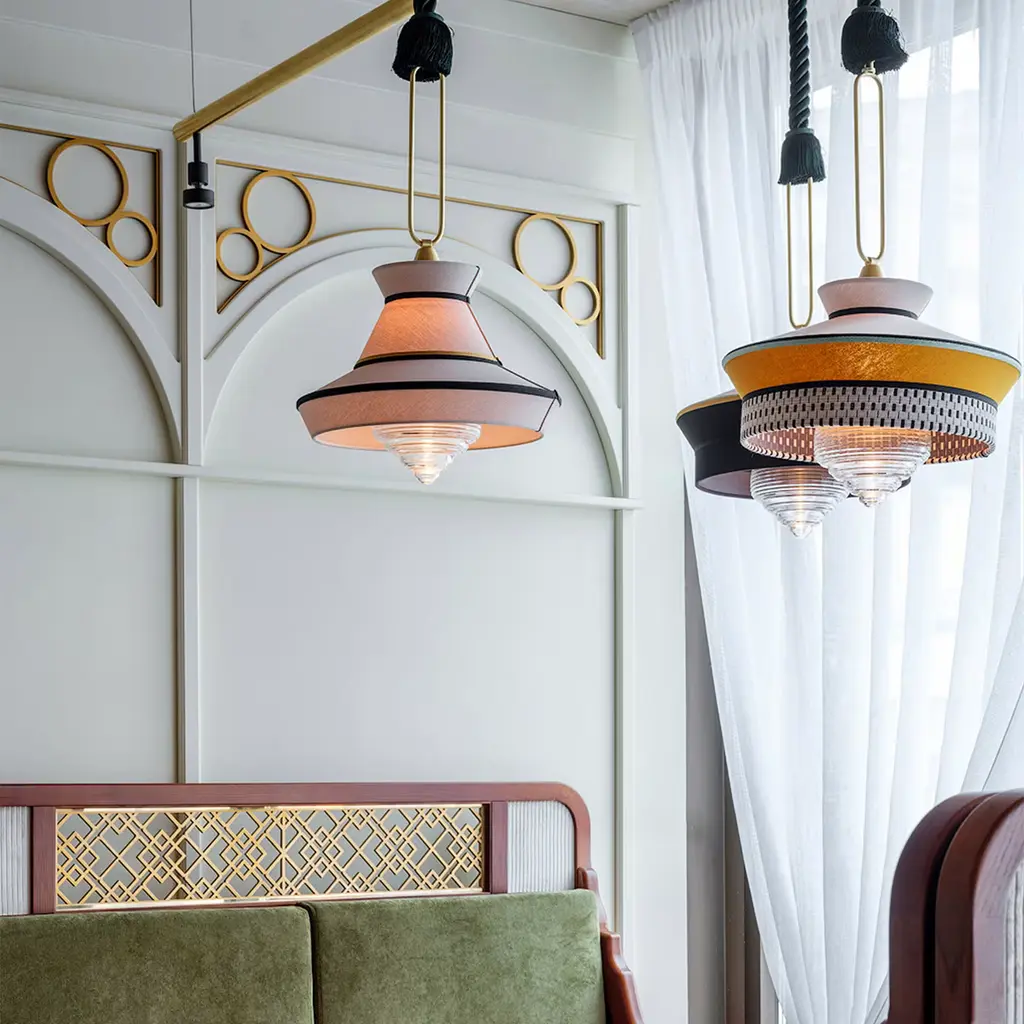 Calypso is a collection of suspensions inspired by the art deco period, with fabrics whose textures and white and black\ngeometric patterns mix with bright colors of South American and tropical culture, providing a very original result. The indoor\nversion is characterized by a green braided silk rope. The metal support is a satin brass finished ring. The diffuser is in\ntransparent glass.