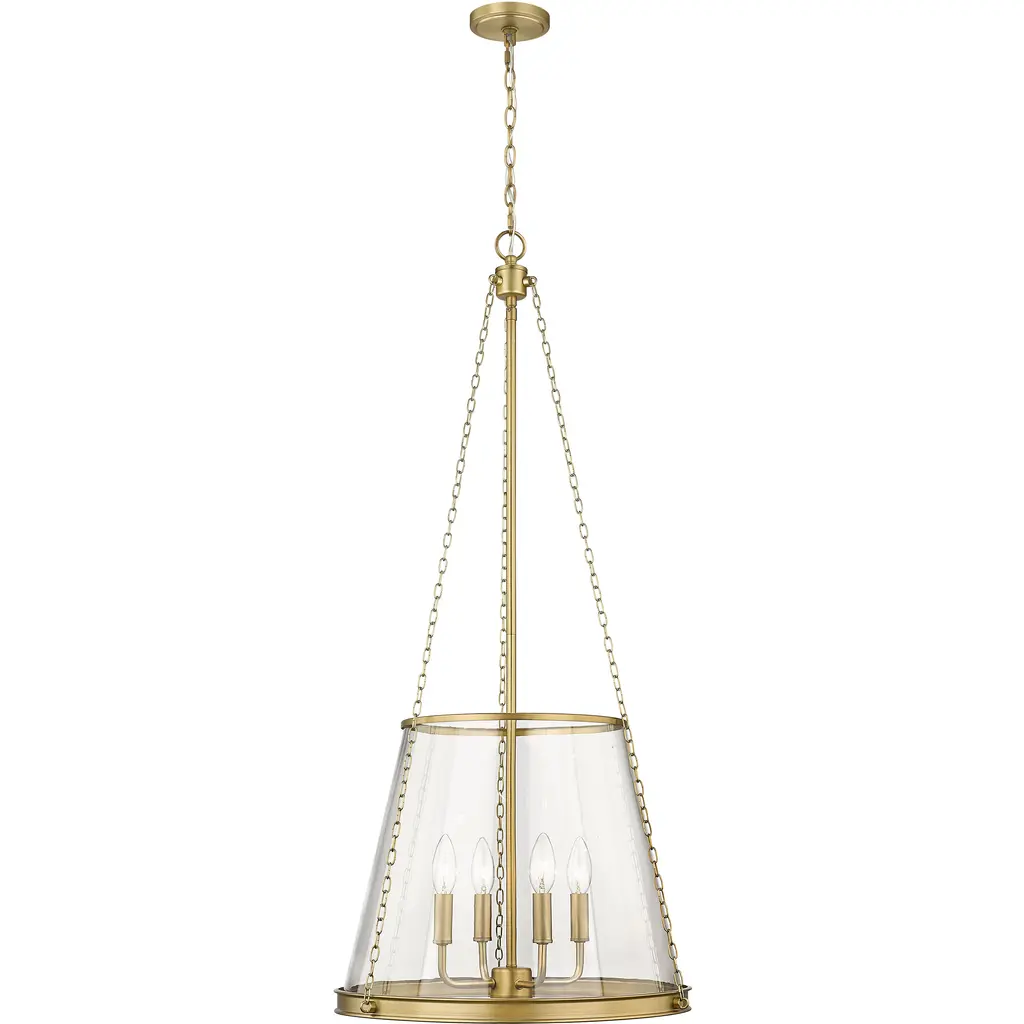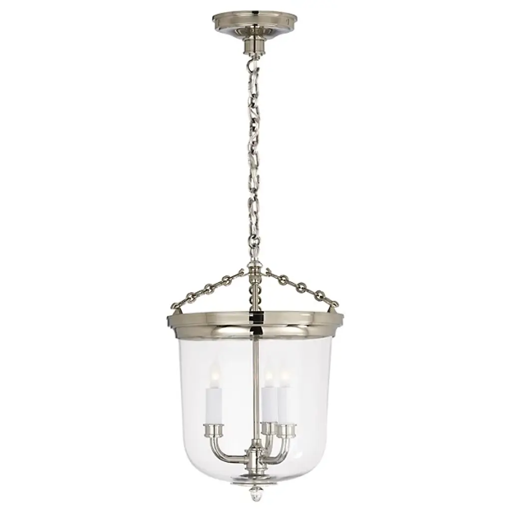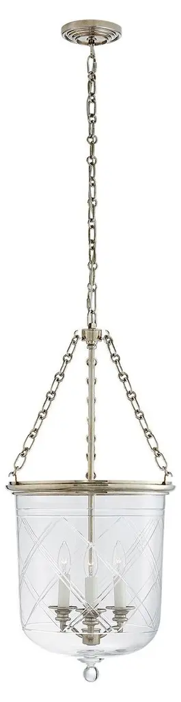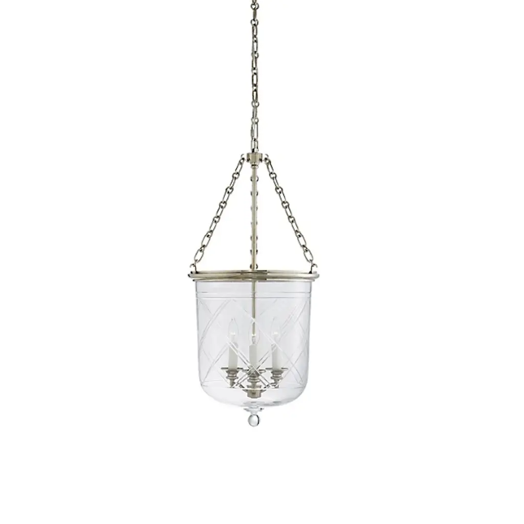Like the beautiful patterning on one of designer Ralph Lauren’s fashions, the Ralph Lauren designed Cambridge Pendant etches a chic, sophisticated design across its elegant glass. Let it shine on its own or in unison as series thanks to a low-profile canopy and chain-link suspension. Sleek metal tubing sends out a congregation of classy metal bobeche accents topped with candle-like lamp holders. Criss-crossing accents slice over a clear glass shade; they shine brilliantly as a warm glow penetrates through in seductive highlights.