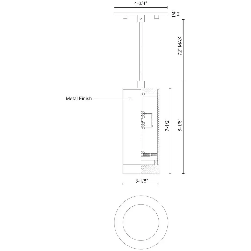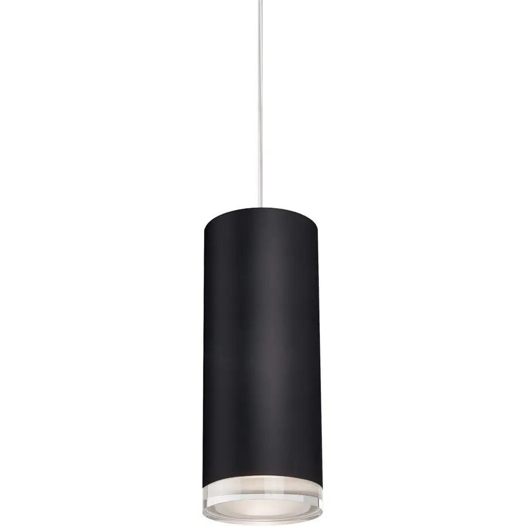 Single LED cylinder shaped pendant with glass disc. Equipped with our powerful 120V AC LED technology, with metal details in white, black or brushed nickel finish. Round canopy matches the selected finish.