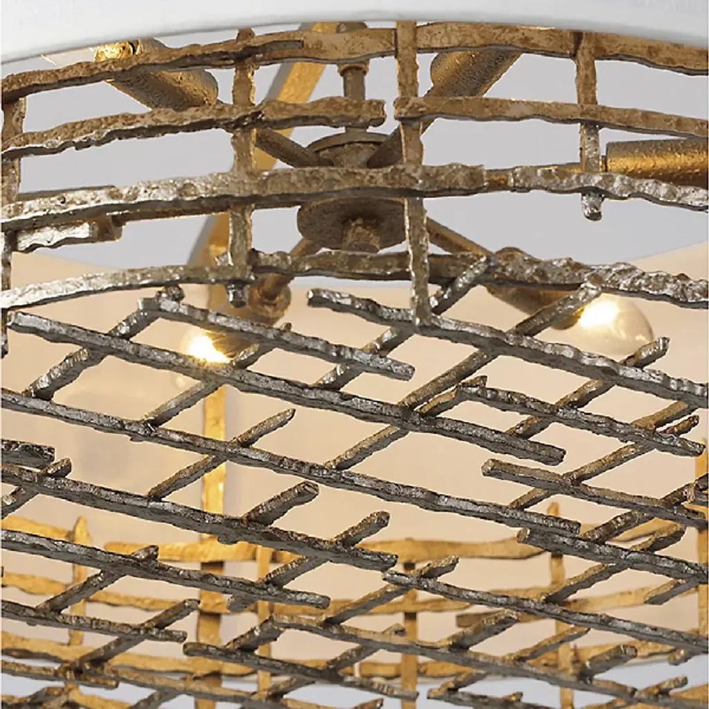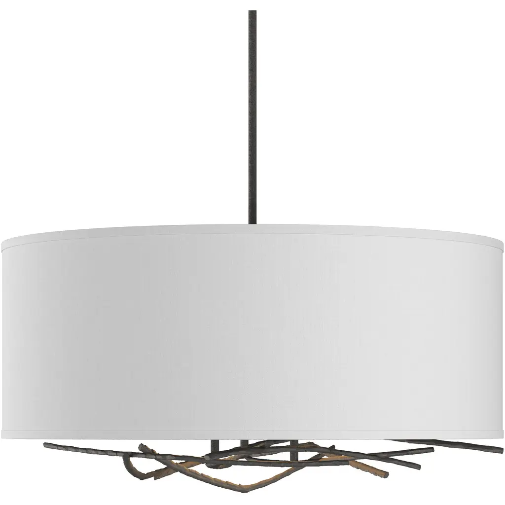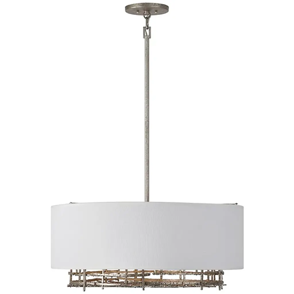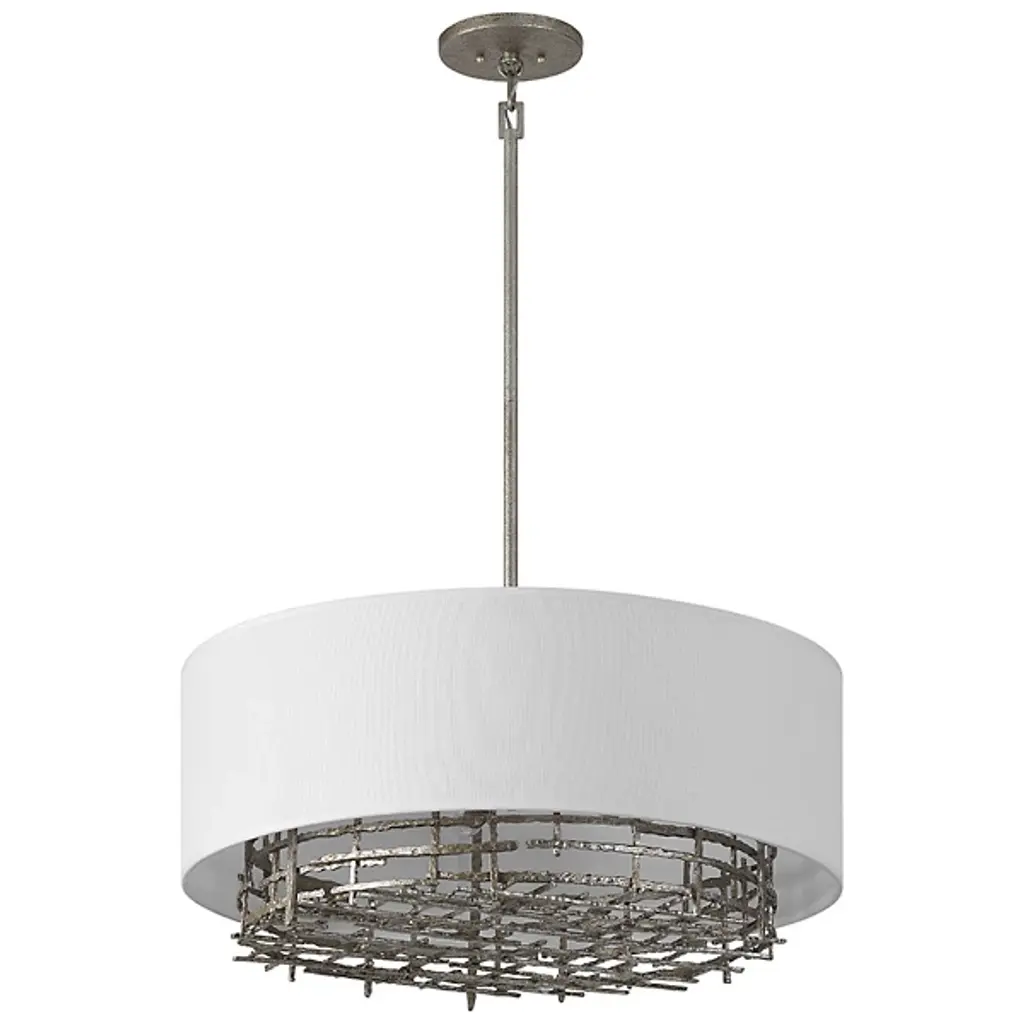 The Cameo Pendant from Savoy House is an entrancing dance of opposites, where rustic fascination meets refined grace. It features a generous drum shade of pristine linen, hovering like a cloud above an intricately textured base. Beneath the shade, a secret garden of metalwork unfurls. Delicate tendrils and branches intertwine, creating a nest-like structure that speaks of nature’s raw beauty. Over a dining table, it becomes a conversation piece, inviting guests to admire its unique blend of textures and forms.