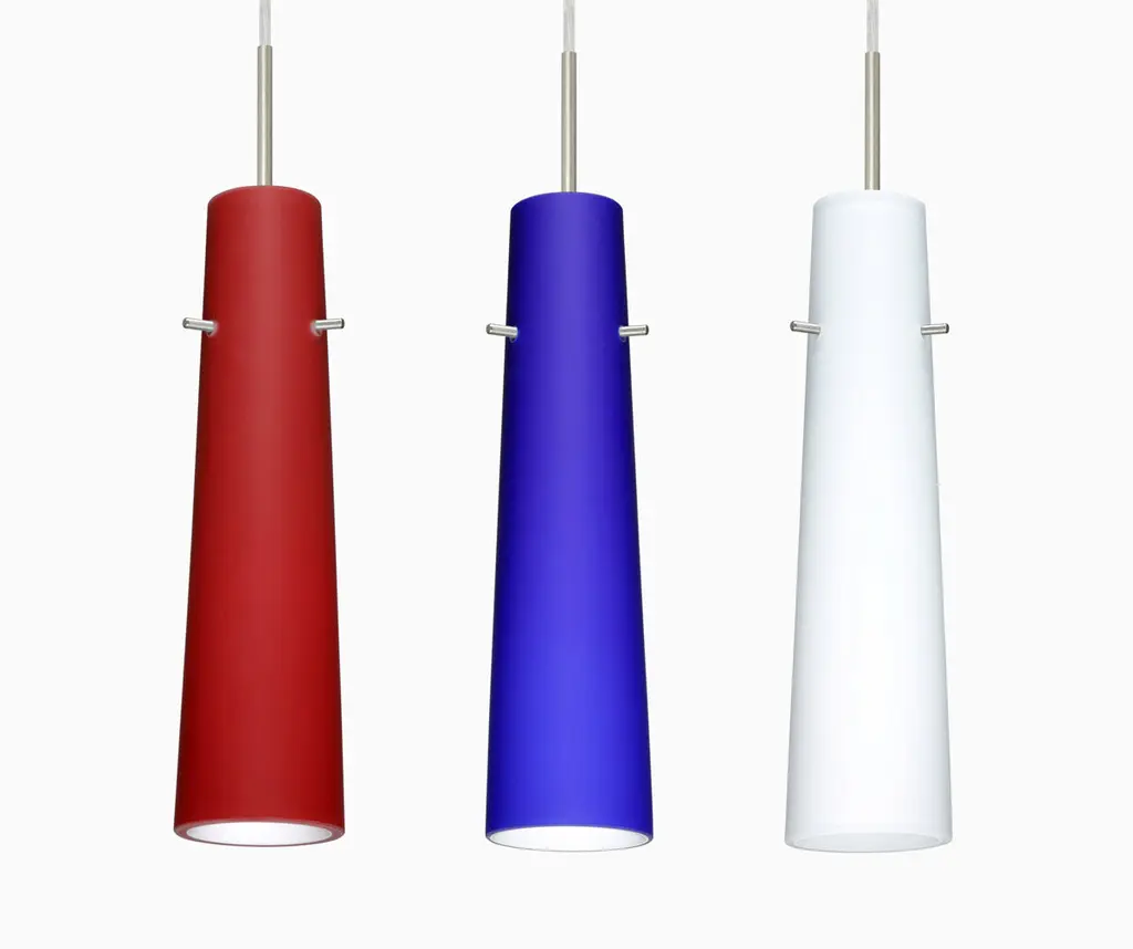 Camino is a softly tapered narrow cylinder, creating a refined contemporary look. Our Ruby Matte glass is a deep red cased glass. This décor can add a contemporary feel to any room. When lit this glass gives off a light that is functional and vibrant. The smooth satin finish on the outer layer is a result of an extensive etching process. This blown glass is handcrafted by a skilled artisan, utilizing century-old techniques passed down from generation to generation. The stem pendant fixture is equipped with an adjustable telescoping section, 4 connectable stem sections (3", 6", 12", and 18") and low Profile flat monopoint canopy. These stylish and functional luminaries are offered in a beautiful Satin Nickel finish.
