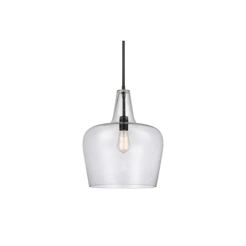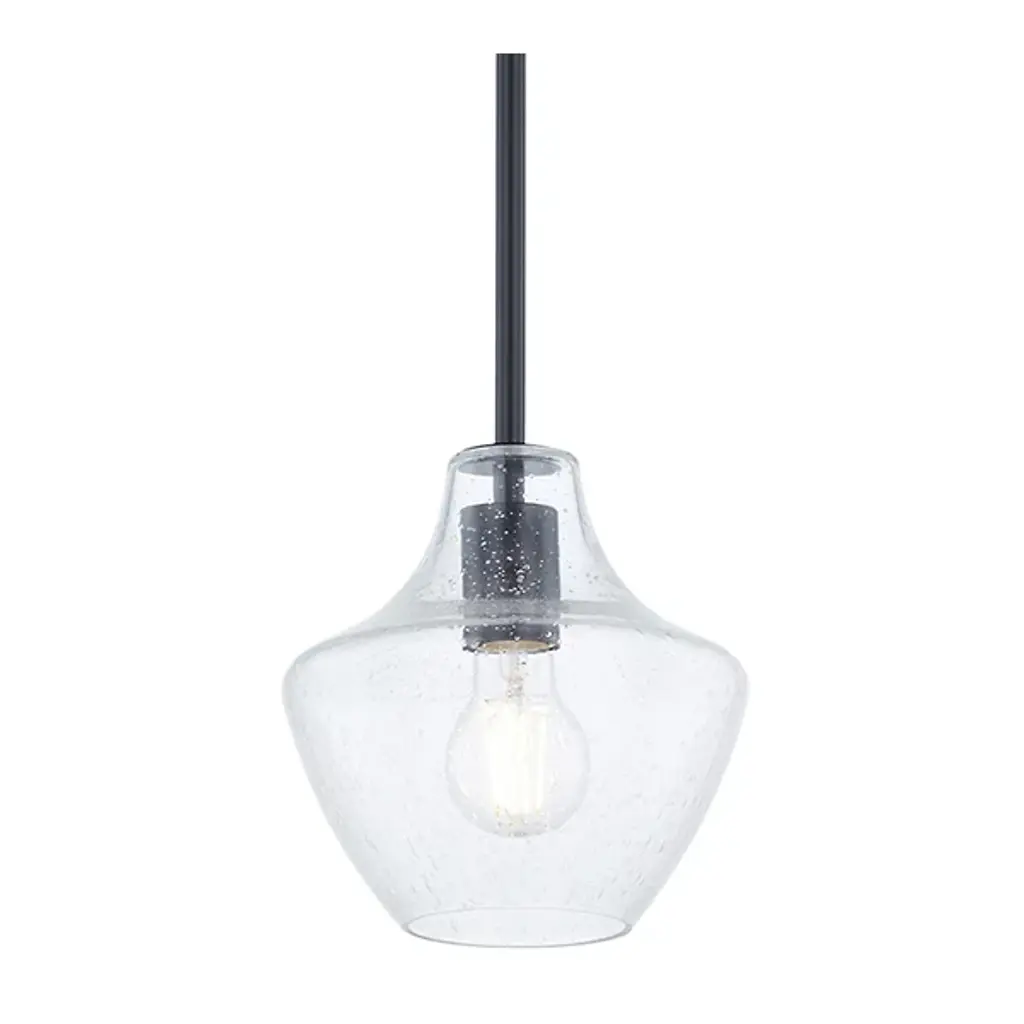 A simple yet effective piece, the Camrin Mini Pendant from Minka-Lavery brings an appealing touch of light to the rooms of your modern home. Descending from the ceiling on a long and thin downrod, this piece features a single, downward-facing bulb tightly wrapped in an angular, clear glass shade. The layer of glass features noticeable irregularities that present in the room as a unique display of bright and even light.