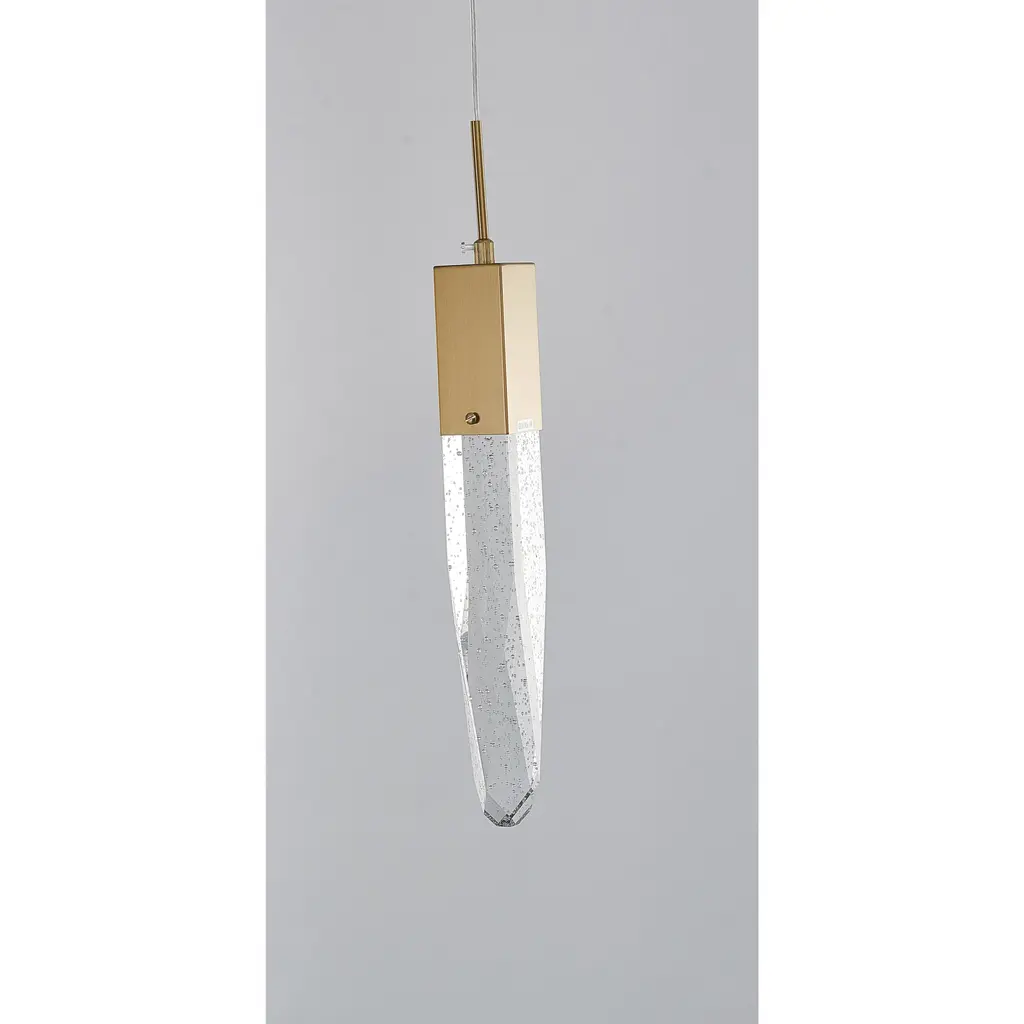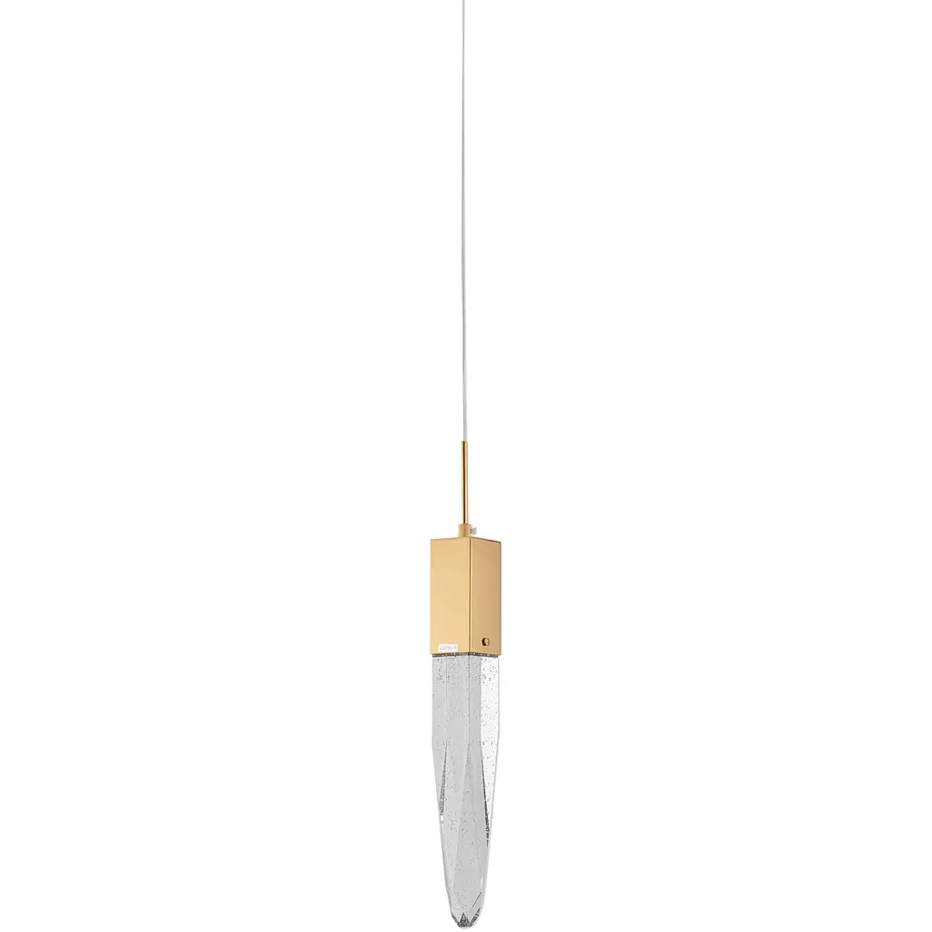 This transitional pendant light features a clear iceberg bubble crystal shade that measures 2 inches in length, 2 inches in width, and 19.6 inches in height. The crystal shade is surrounded by a sleek and modern gold frame that provides a sophisticated contrast to the clear crystal. The clear iceberg bubble crystal shade adds a touch of luxury and sophistication to the design, while the gold metal frame provides a modern and sleek contrast. This pendant light would be perfect for a contemporary living room, bedroom, dinning room, hallway, or kitchen, as it adds a touch of elegance and sophistication to the space