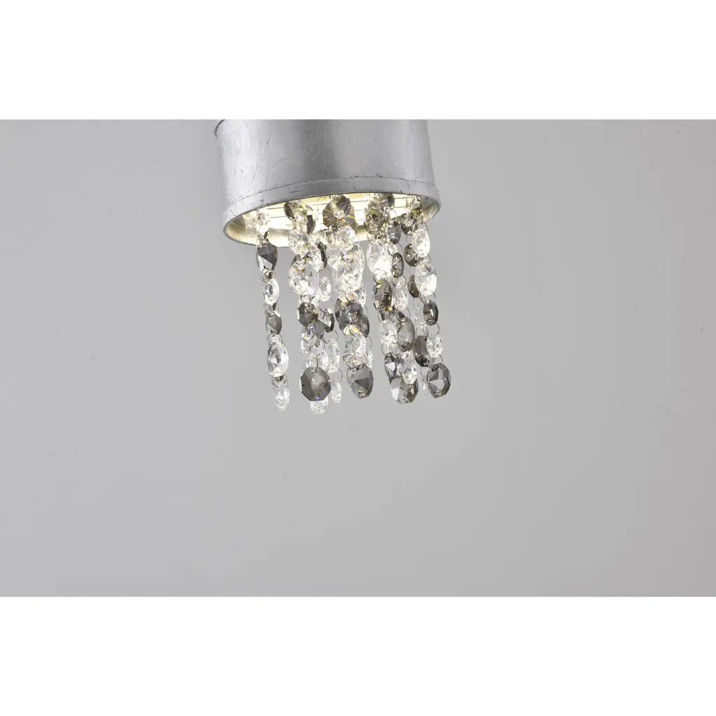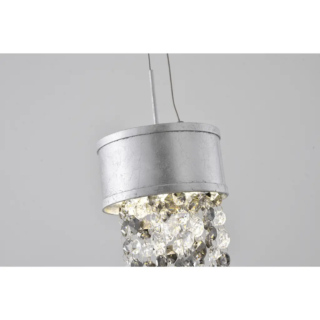 This LED single pendant light features a sleek and modern design, with a gleaming silver leaf frame that adds a touch of luxury to any room. The frame is paired with a clear and smoke-colored crystal accents, which provide a warm and inviting glow. The light is powered by an energy-efficient LED bulb, emitting a bright and crisp 4000K light with a gentle 9W output. Measuring 5.9 inches in diameter and 9.1 inches in height, this pendant light is perfect for hanging above a bedroom, living room, or dinning room.
