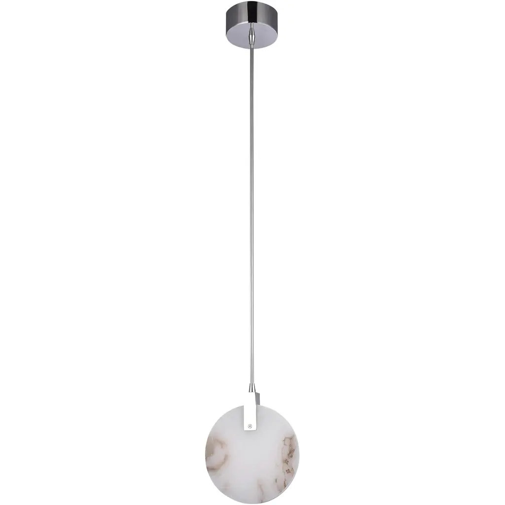 If you are looking for a light source for your bedroom, living room, kitchen island, storage, or dinning room, this dimmable LED transitional single pendant can easily fit into your modern home décor. Crafted with a chrome stainless steel frame with a round Spanish alabaster block. The LED bulbs are integrated into the frame. The adjustable rod links make this fixture suitable for most ceiling heights.