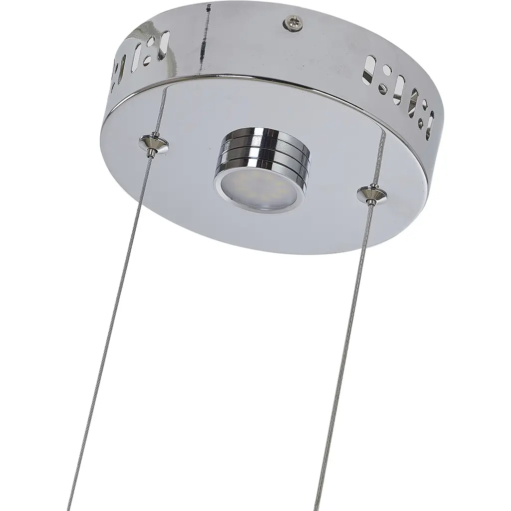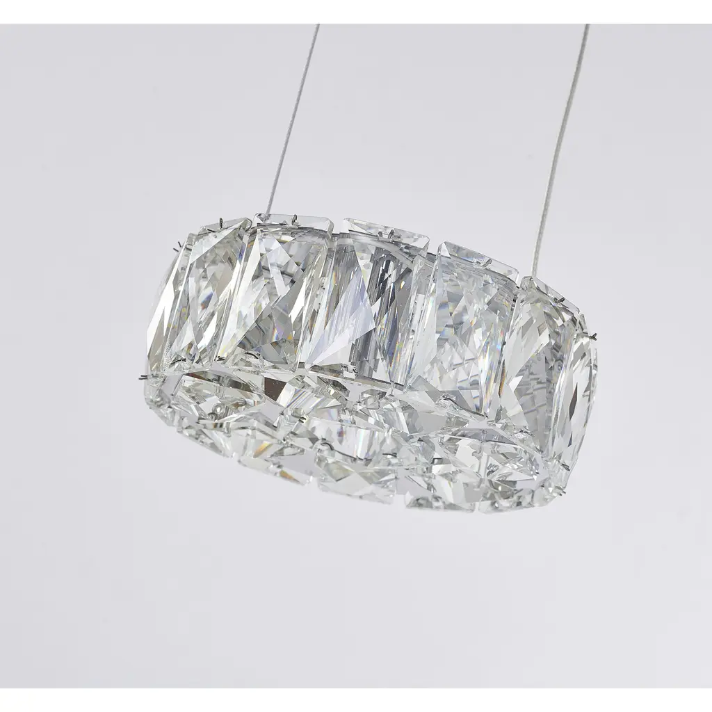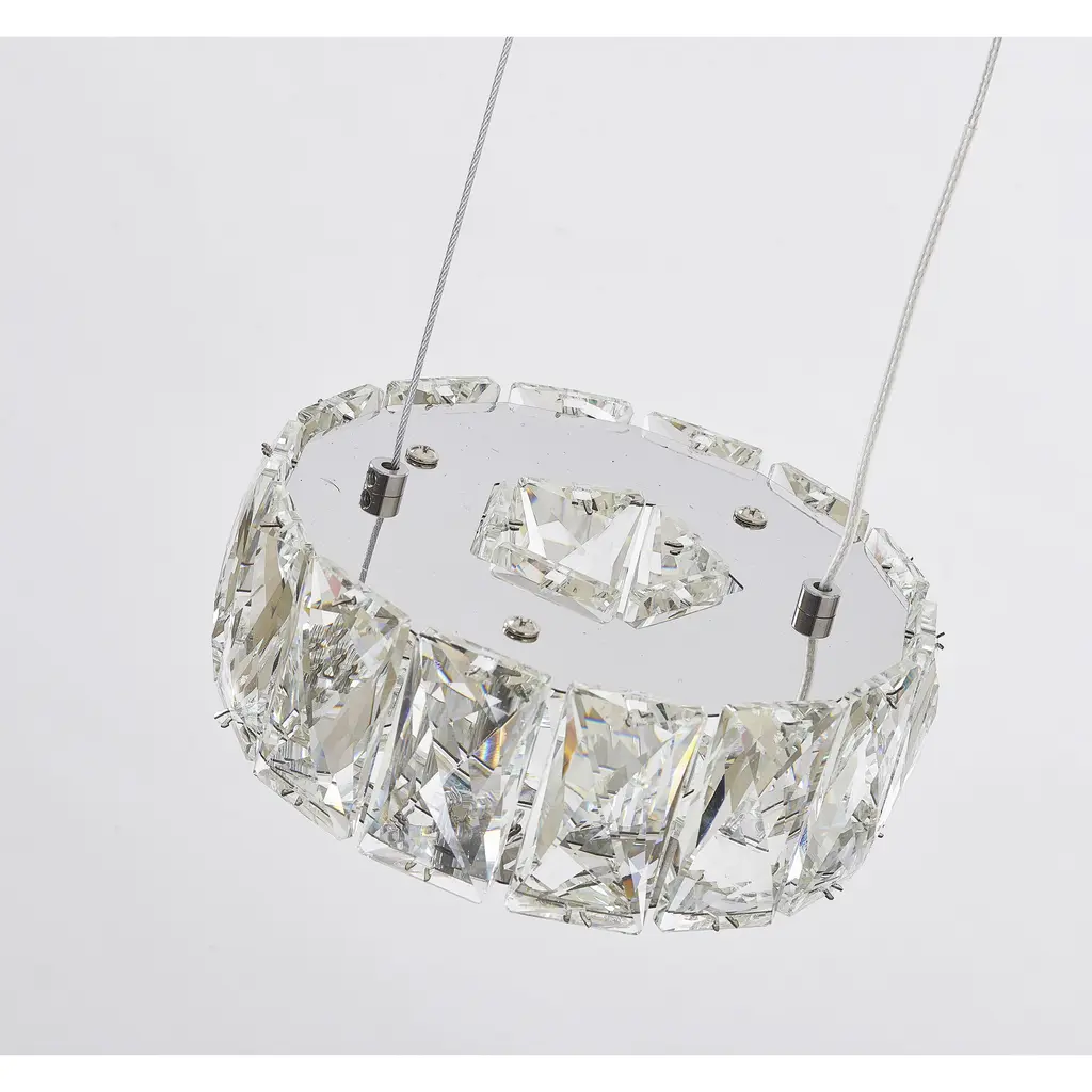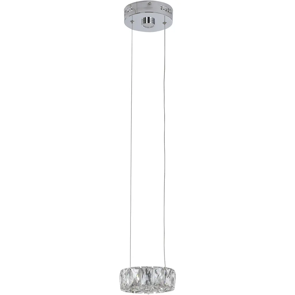 This transitional chrome LED single pendant light is a stunning addition to any room. Measuring 6 inches in diameter and 1 inch in height, it's a compact and elegant piece that provides a warm and inviting glow. The round crystal cover is made of high-quality glass and is designed to refract and diffuse the light, creating a beautiful and unique visual effect. The pendant light features a 5W LED bulb with a 4000K color temperature, providing a bright and energy-efficient light source. This makes it perfect for illuminating a kitchen, dinning room, bedroom, or living room.