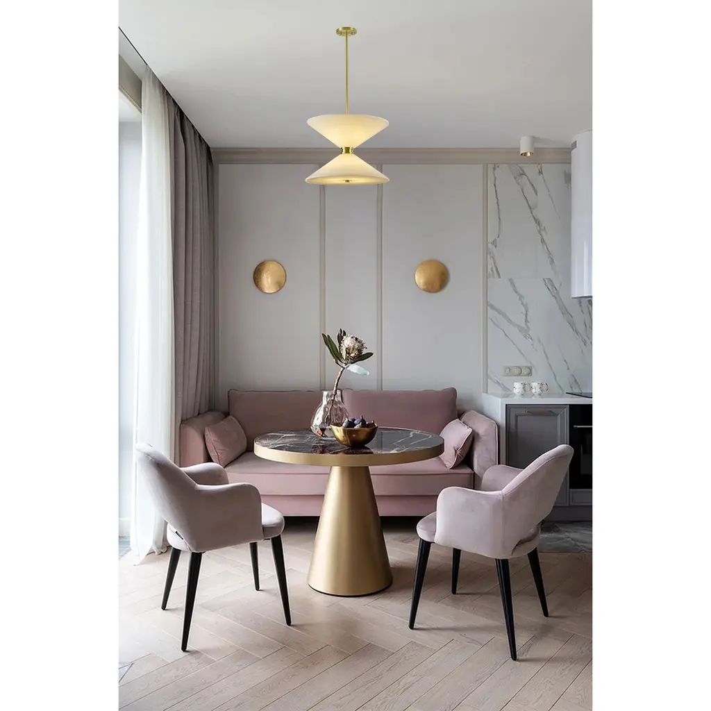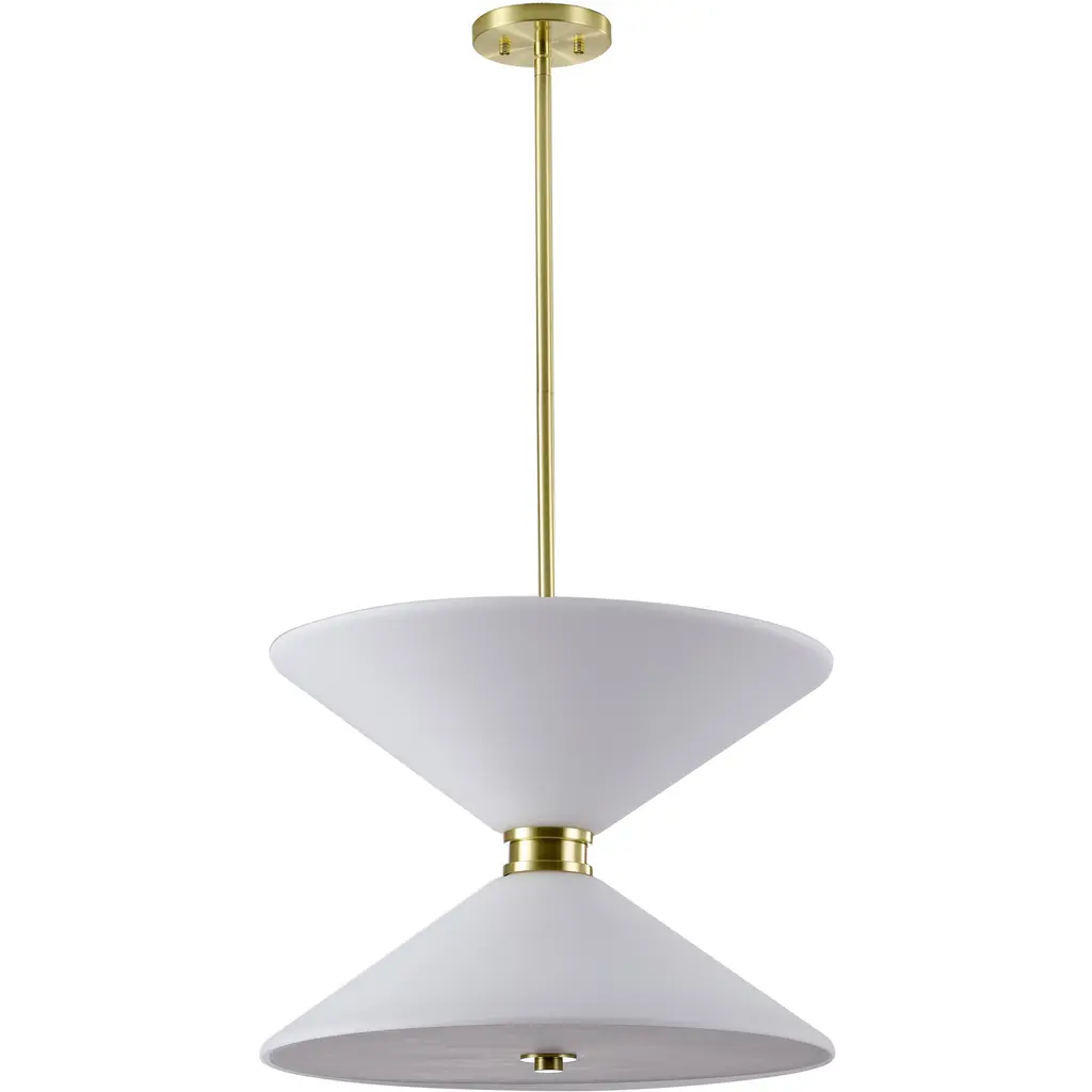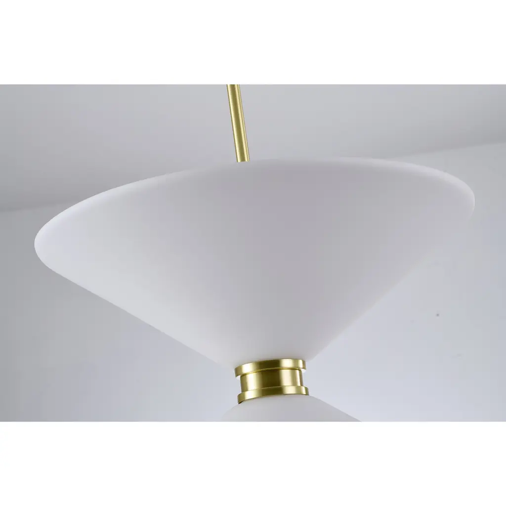 This transitional pendant is a beautiful and elegant lighting fixture that adds a touch of sophistication and refinement to any room. The satin brass metal frame provides a warm and inviting look, while the white frosted glass shade adds a touch of softness and subtlety. The lamp's dimensions of 23.25 inches in diameter and 16 inches high make it a great option for bedroom, living room, dinning room, entryway, or hallway. The 8xG9 base is compatible with standard light bulbs (Bulbs Not Included), and the 40W rating means it can provide a bright and warm glow.