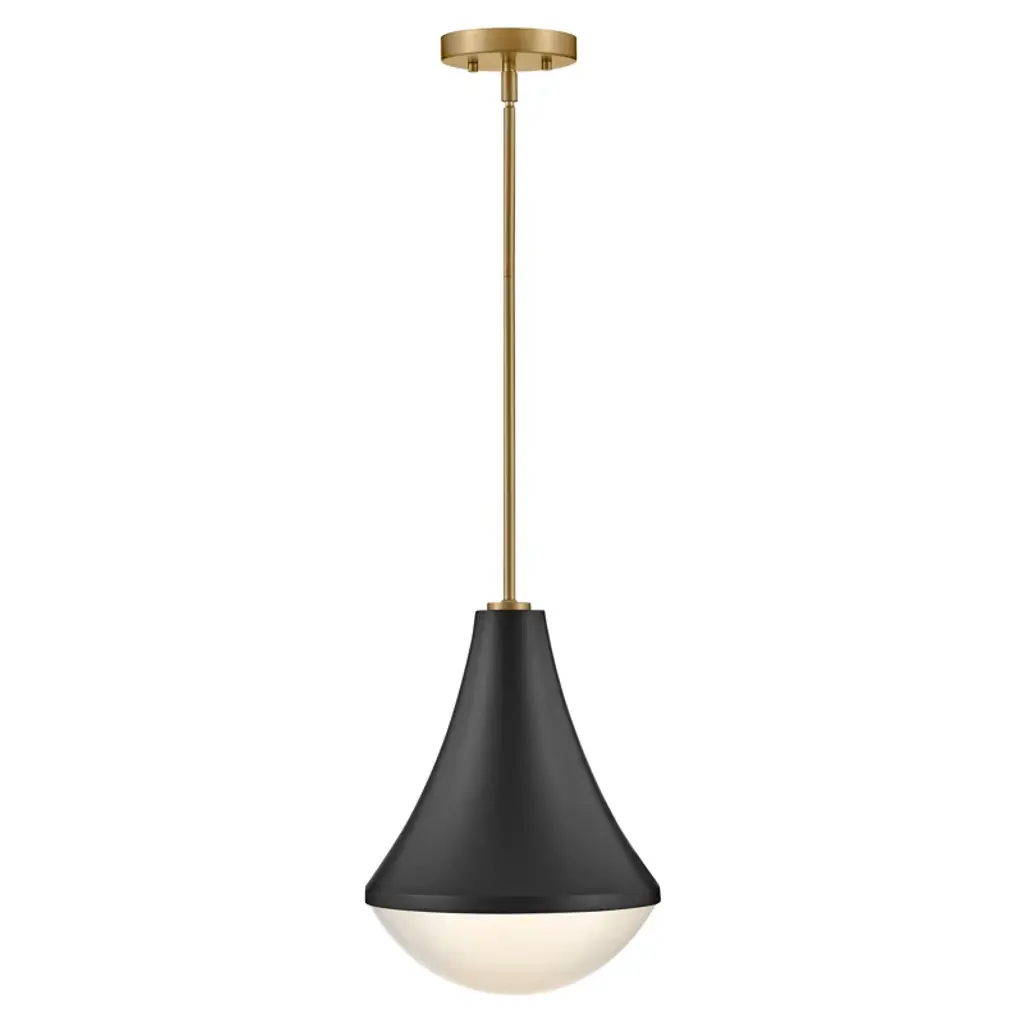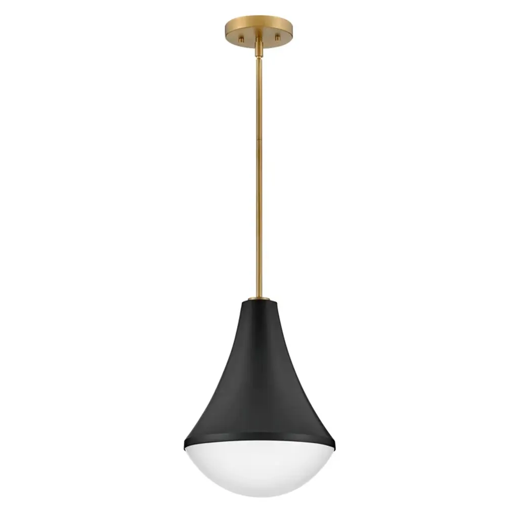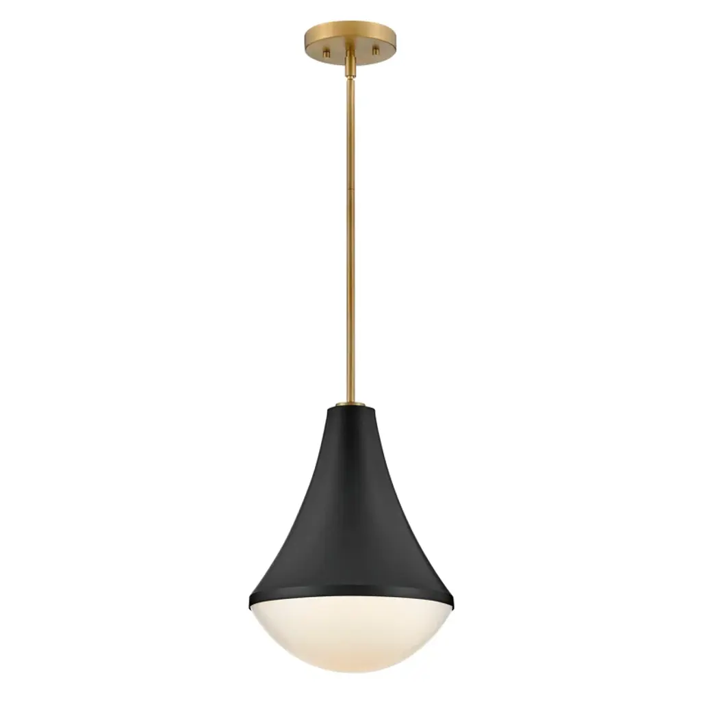 A sleek, tapered pendant and curved Cased Opal Glass shade create a symmetric silhouette, suspended from an adjustable Lacquered Brass stem. Available in a trio of complementary finishes - Black, Lacquered Brass, and Seafoam - this shapely Mid-Century Modern-ish teardrop style light fixture can be installed on even or sloped ceilings (up to 90°). Its simplistic color scheme fits homes (kitchens, living areas, bedrooms, foyers) and commercial (cafes, restaurants, salons, boutiques).