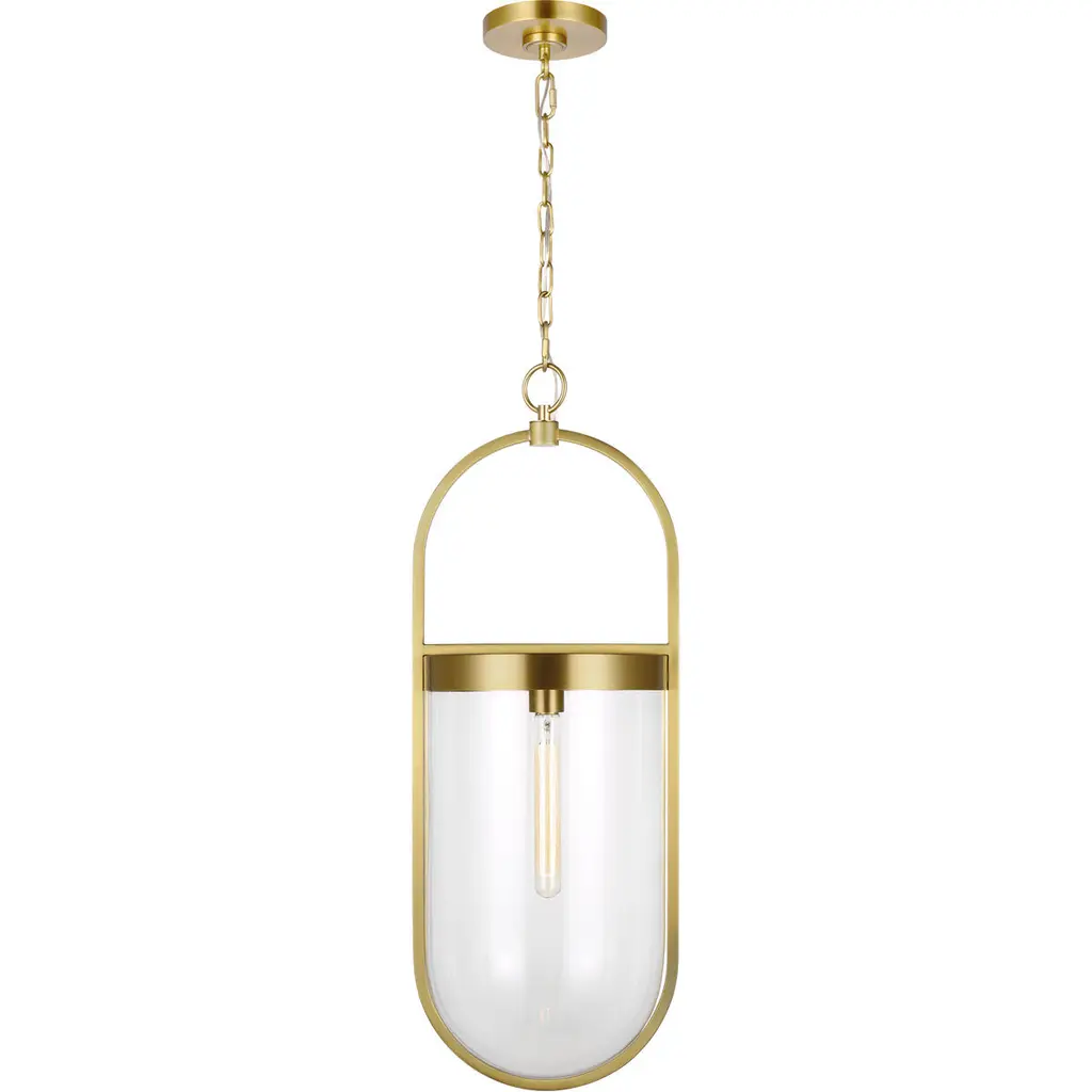 The Blaine one light indoor pendant in aged iron by Chapman & Myers is a simple modern interpretation of a classic glass smoke bell lantern. Each pendant is suspended from a unique oval frame which is circumscribed around an inner glass shade. The glass is held in place by a banded metal collar at the top and lit from within with a single filament bulb.