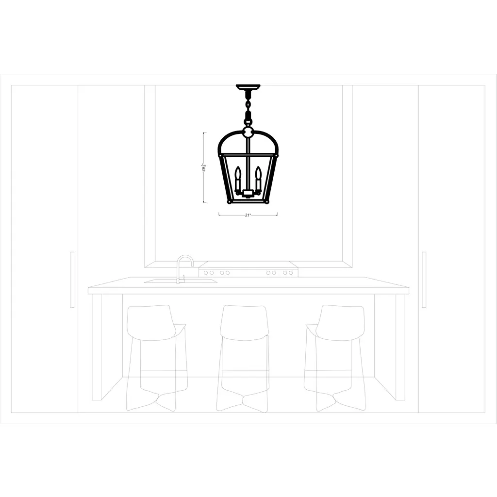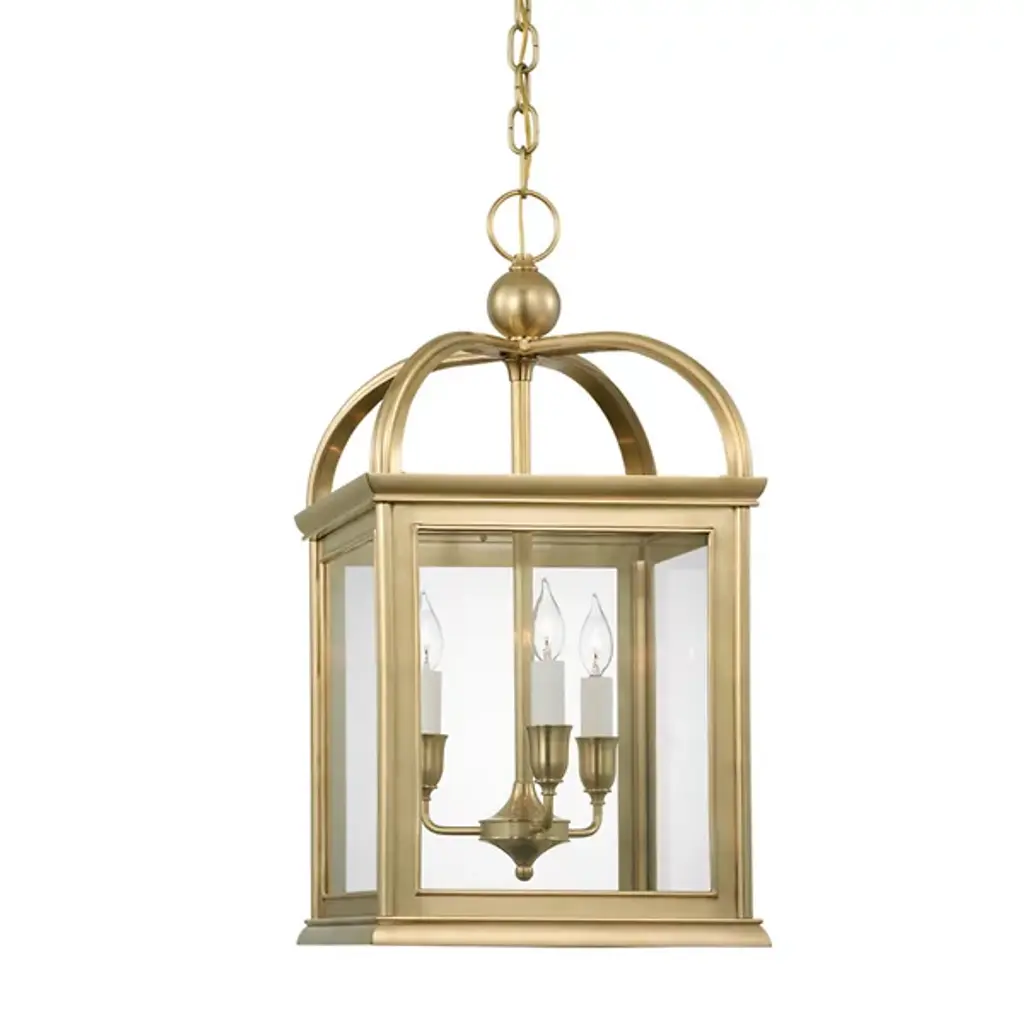 The Charleston four light indoor pendant in Satin Brass is crafted from metal, its frame is steeped in sophistication with an openwork silhouette accented by a curved top. Candelabra-inspired lights sit inside, highlighted by glass panels for a warm and even gleam.
