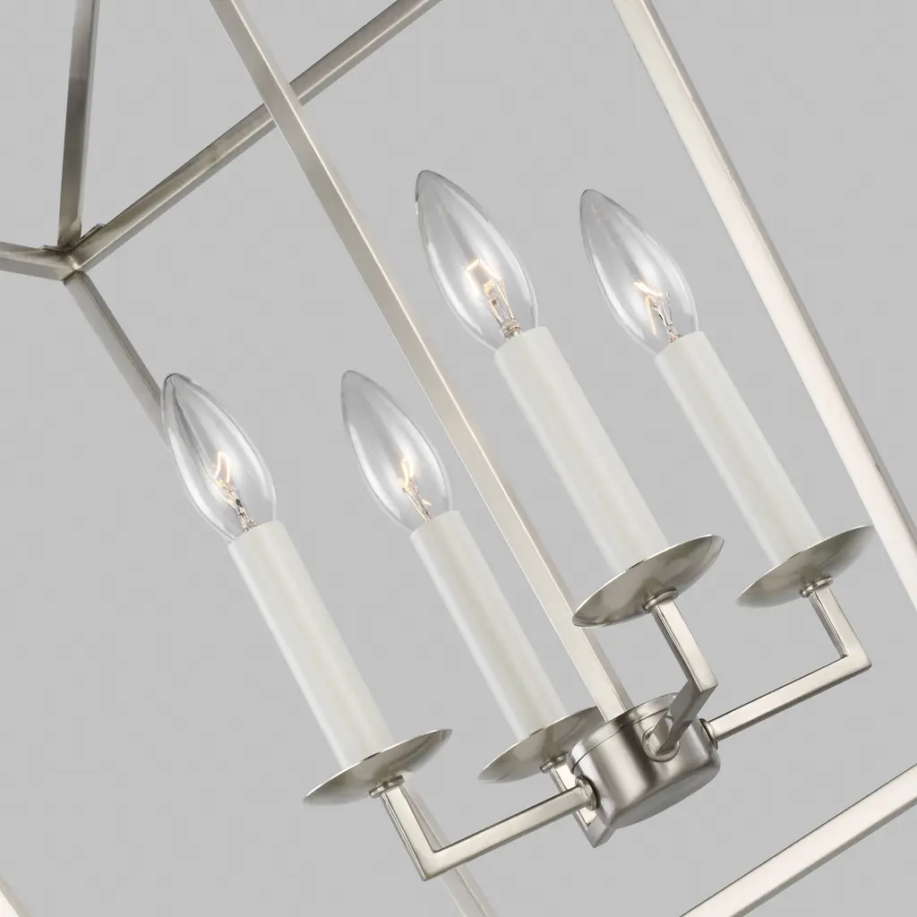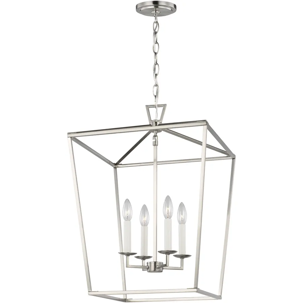 The Dianna contemporary lantern pendant by Generation Lighting is offered in the Midnight Black, Satin Bronze or Brushed Nickel finish. The dark and transitional open frame encompass generously proportioned candelabra style bulbs. This updated silhouette brings a modern element to your cozy ambient lighting design.