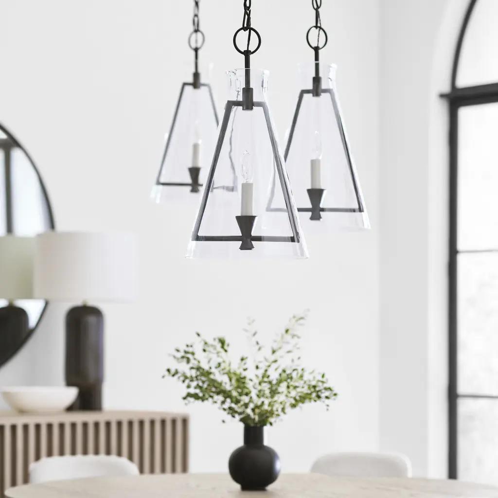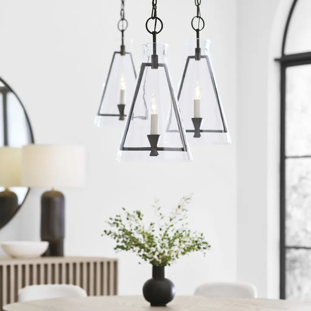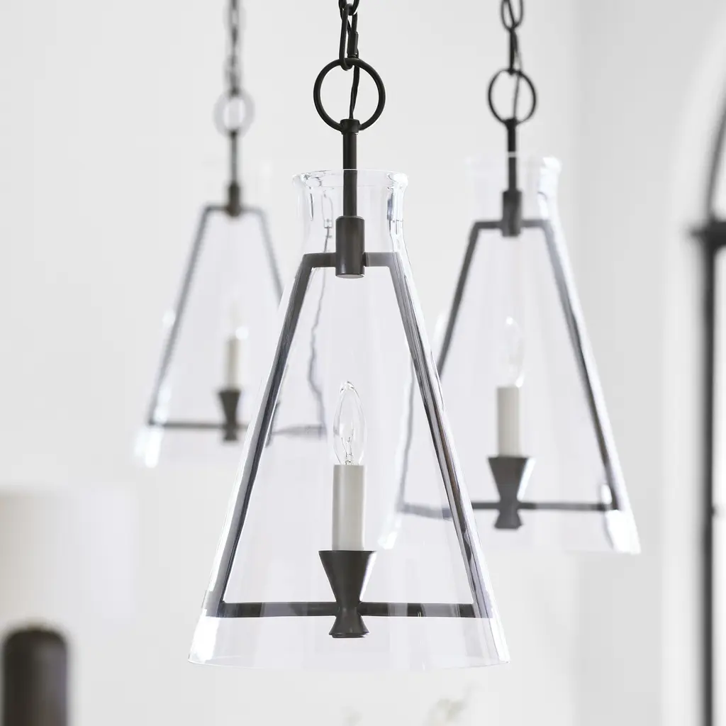 The Keystone one light indoor pendant casts a warm and inviting glow with its candelabra, set within an angular, Aged Iron frame and quarter inch thick clear glass. This series of chandeliers, sconces and pendants designed by Chapman & Myers for Generation Lighting features very detailed construction including bobeches supporting each candle tube. The candle cup is based on a totem shape candle created by Alberto Giacometti and the frame is a re-interpretation of a one of Diego Giacometti¦s hanging sculptures.