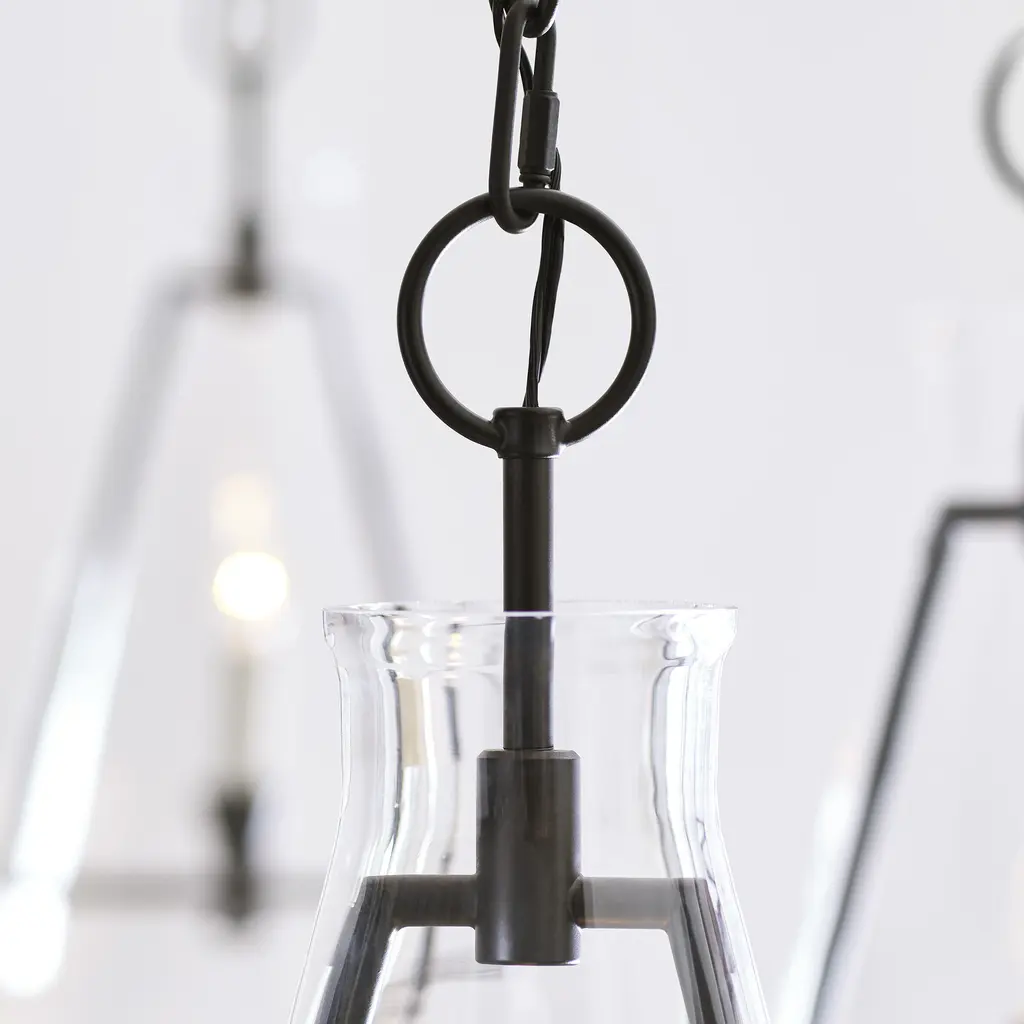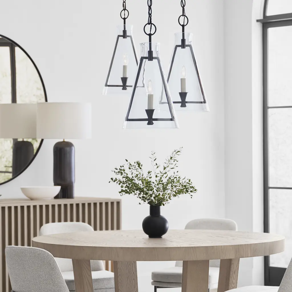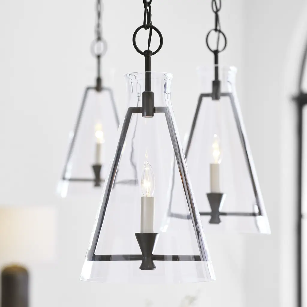 The Keystone one light indoor pendant casts a warm and inviting glow with its candelabra, set within an angular, Aged Iron frame and quarter inch thick clear glass. This series of chandeliers, sconces and pendants designed by Chapman & Myers for Generation Lighting features very detailed construction including bobeches supporting each candle tube. The candle cup is based on a totem shape candle created by Alberto Giacometti and the frame is a re-interpretation of a one of Diego Giacometti¦s hanging sculptures.