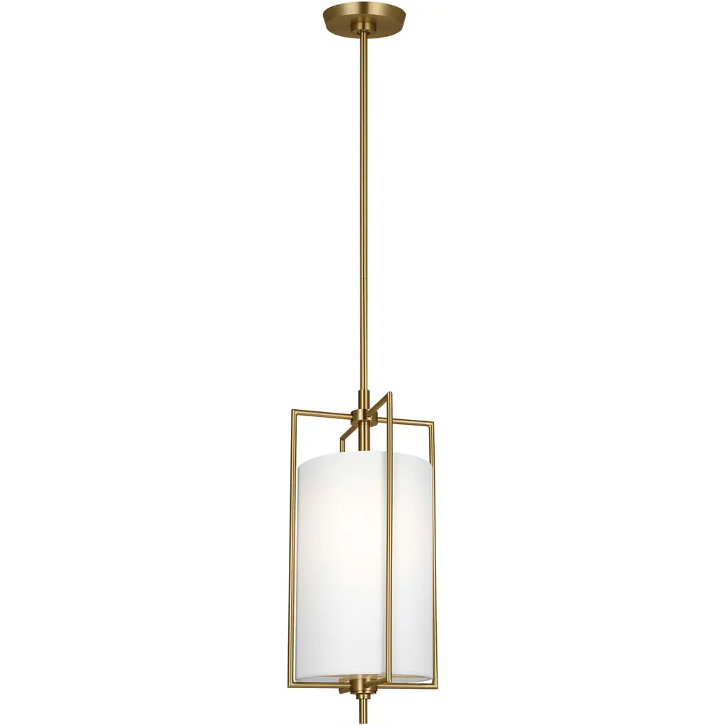 The Perno one-light shade pendant in Burnished Brass by Chapman and Myers was inspired by a vintage mid-century French sconce with a simple metal armature. The minimal cruciform structure of the metal frame is the main feature of the design. The frame outlines and supports the inner cylindrical shade. All of the assembly hardware for installing the inner shade was engineered to be hidden in order to maintain the clean and simple aesthetic of the light.