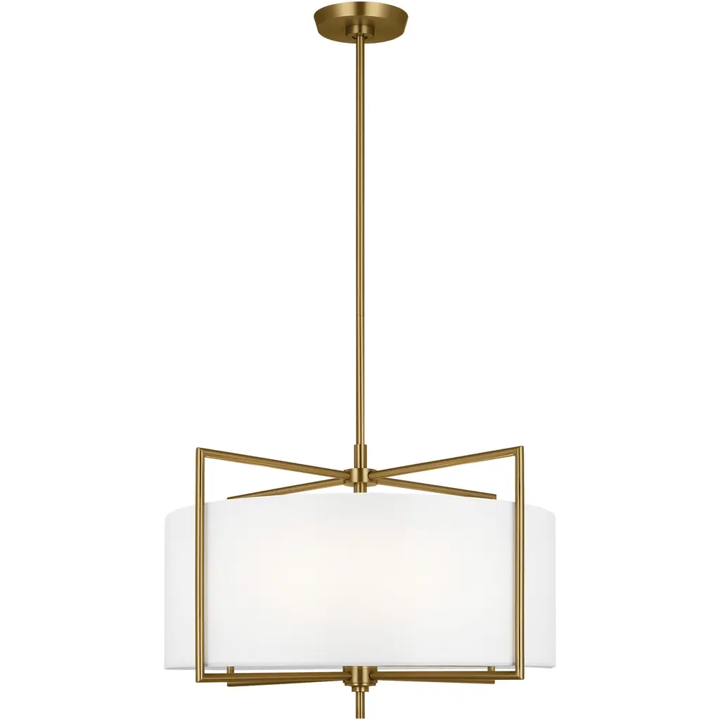 The Perno four-light shade pendant in Aged Iron by Chapman and Myers was inspired by a vintage mid-century French sconce with a simple metal armature. The minimal cruciform structure of the metal frame is the main feature of the design. The frame outlines and supports the inner cylindrical shade. All of the assembly hardware for installing the inner shade was engineered to be hidden in order to maintain the clean and simple aesthetic of the light.