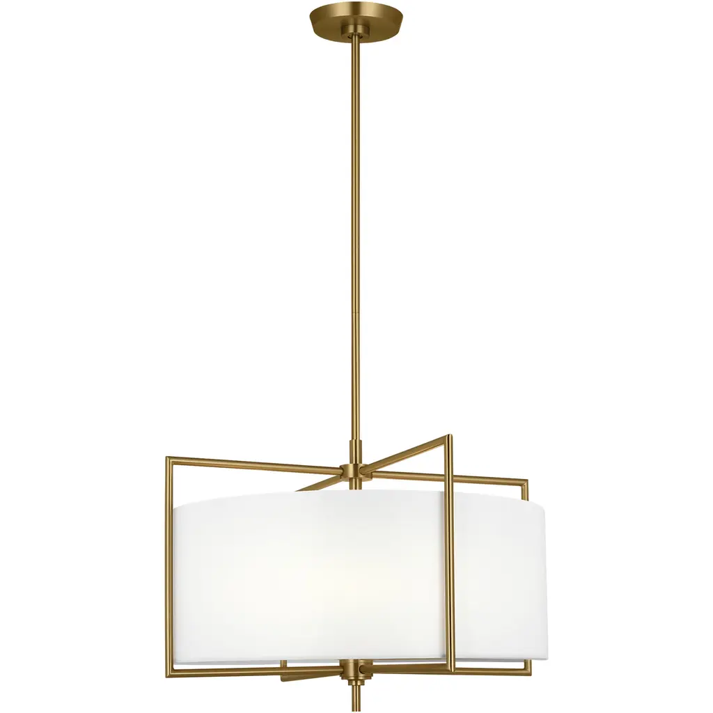 The Perno four-light shade pendant in Burnished Brass by Chapman and Myers was inspired by a vintage mid-century French sconce with a simple metal armature. The minimal cruciform structure of the metal frame is the main feature of the design. The frame outlines and supports the inner cylindrical shade. All of the assembly hardware for installing the inner shade was engineered to be hidden in order to maintain the clean and simple aesthetic of the light.
