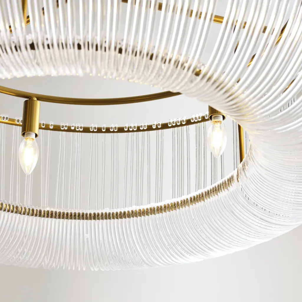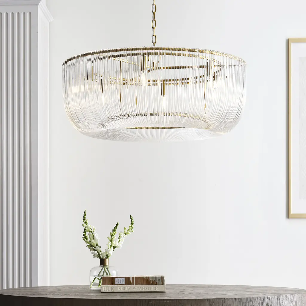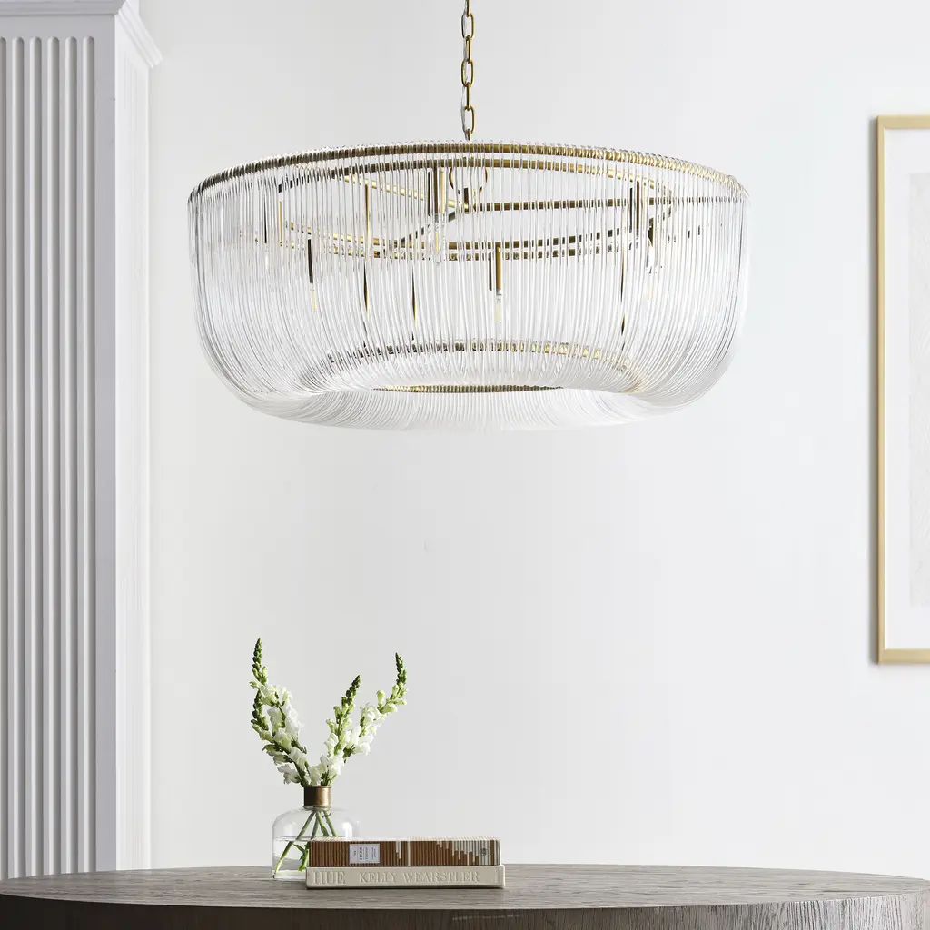 Inspired by traditional crystal basket chandeliers, the Pierce series by Chapman & Meyers updates the classic look with individually bent glass rods. Each rod is carefully looped at the ends to hook onto the metal frame creating minimal details, while the interior candelabra bulbs emit and refract light through the bent glass. The Pierce flush mount will lend an elegant and scintillating touch to living and dining rooms, bedrooms, hallways and entryways.