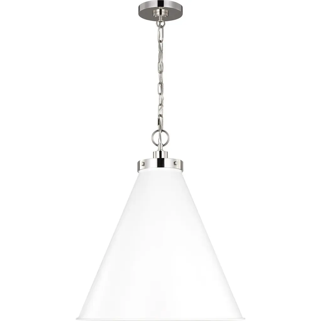 Inspired by various classic utility silhouettes - from factory lighting to barn sconces - capped by contrasting metal hardware. Each shade of the Wellfleet series by Chapman & Myers is available multiple sizes of 3 versatile profiles; either a flat farm dome, a traditional factory dome, or tapered cone. The shades are available with either a black or white finish and are paired with either a burnished brass or polished nickel collar, chain and canopy.
