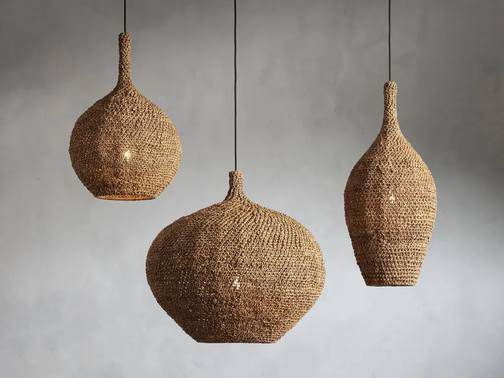 Bring an organic, mixed-material aesthetic to any space with our Canela Lighting Collection. Handwoven by Indonesian artisans from natural banana rope fiber around a metal frame, each textural shade is complemented by a steel base with a brass finish.