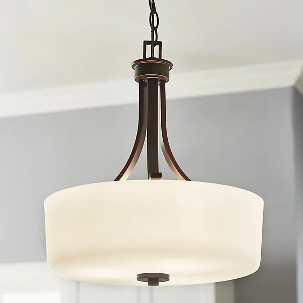The Canfield Pendant by Generation Lighting, formerly known as Sea Gull Lighting, is classic and refined. Four sloping hand-brushed steel arms accentuate a smooth drum of etched glass. The diffuser evenly distributes a warm glow throughout the room, and a metal accent at its center provides support and adds visual interest. Ideal for dining room settings, this fixture will complement many styles of décor.