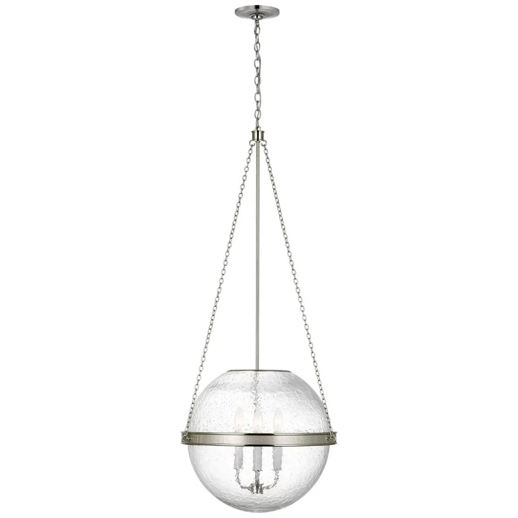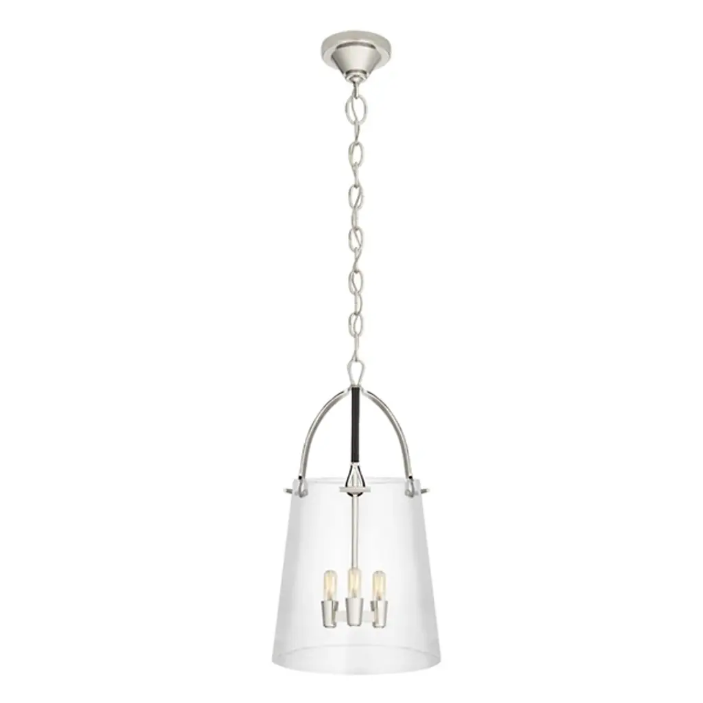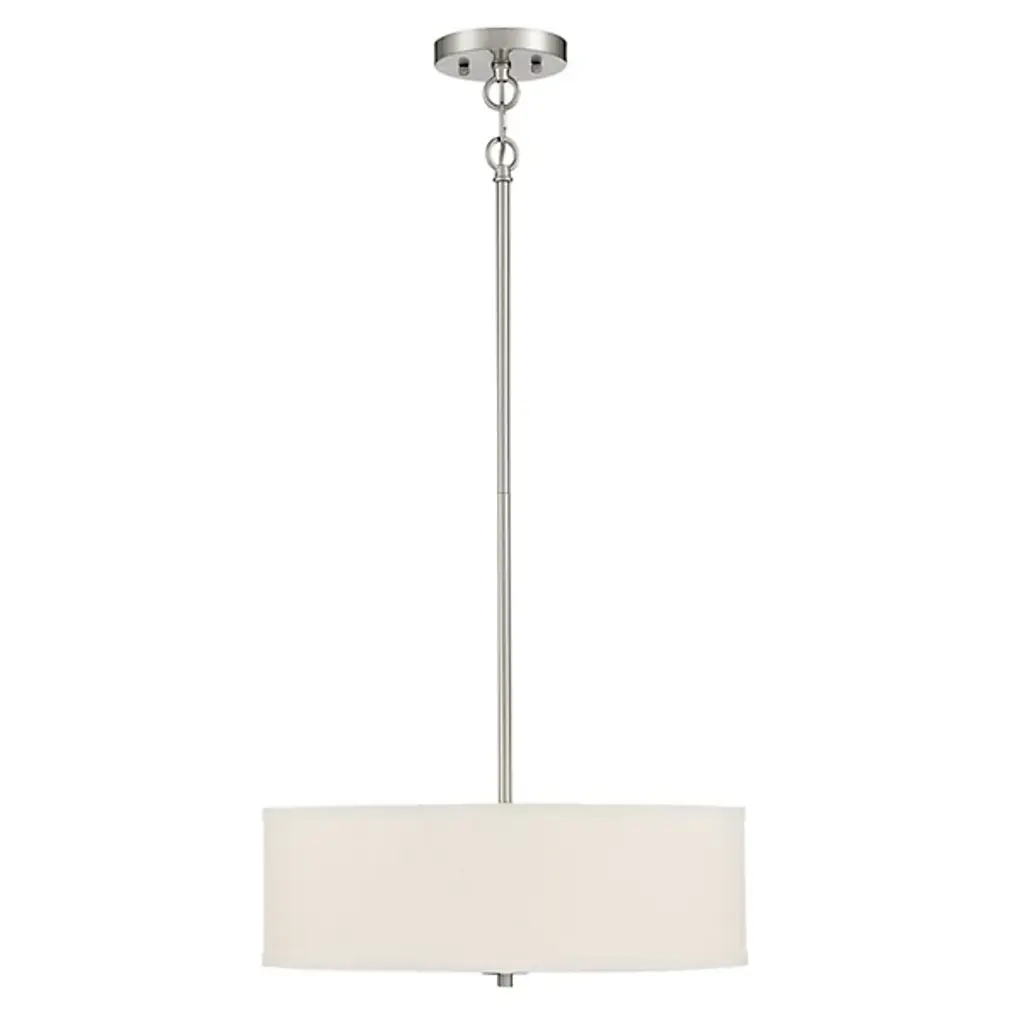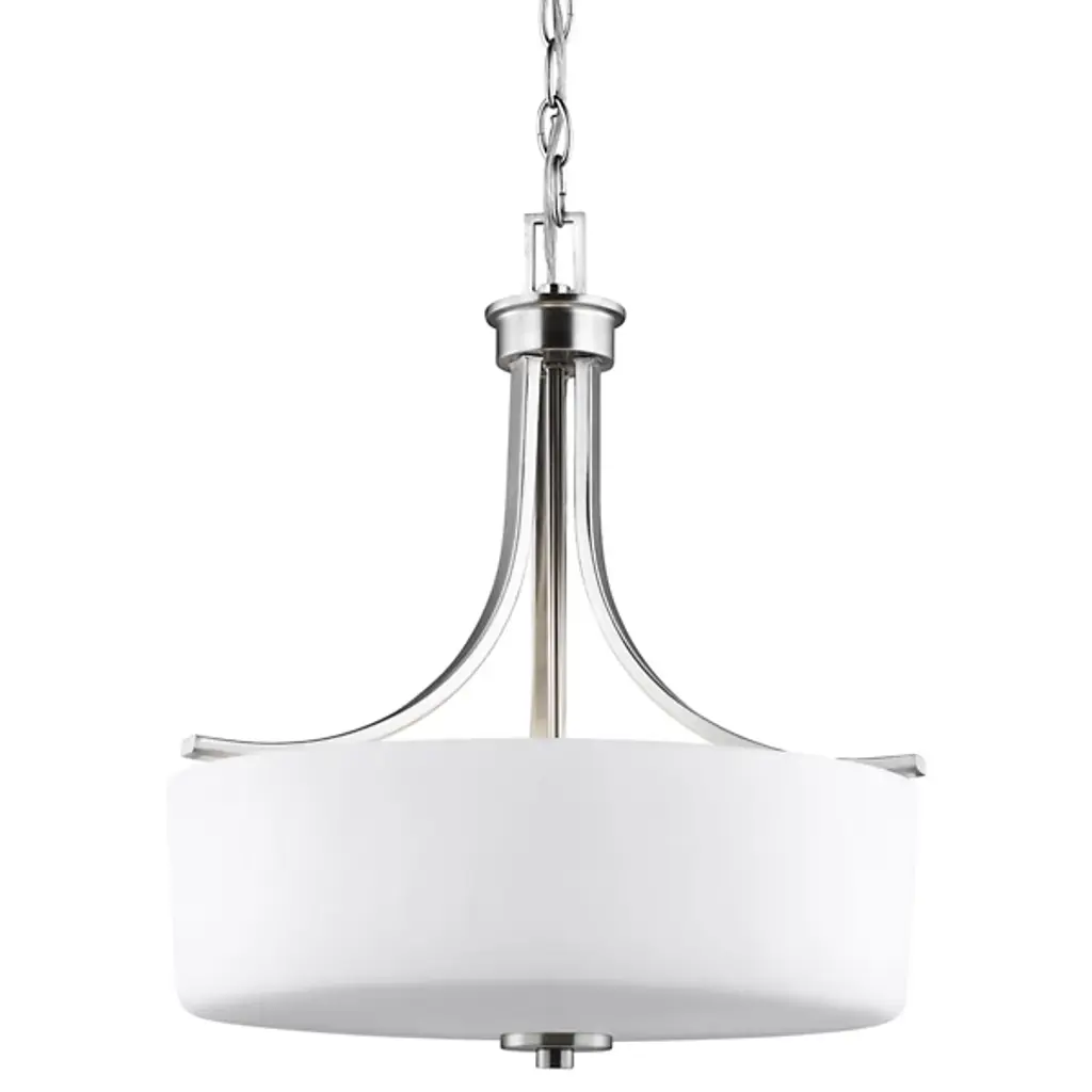 The Canfield Pendant by Generation Lighting, formerly known as Sea Gull Lighting, is classic and refined. Four sloping hand-brushed steel arms accentuate a smooth drum of etched glass. The diffuser evenly distributes a warm glow throughout the room, and a metal accent at its center provides support and adds visual interest. Ideal for dining room settings, this fixture will complement many styles of décor.