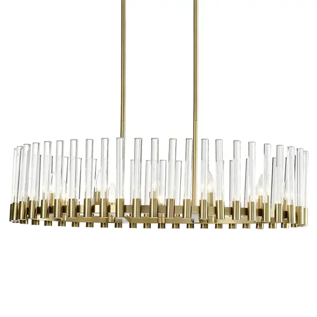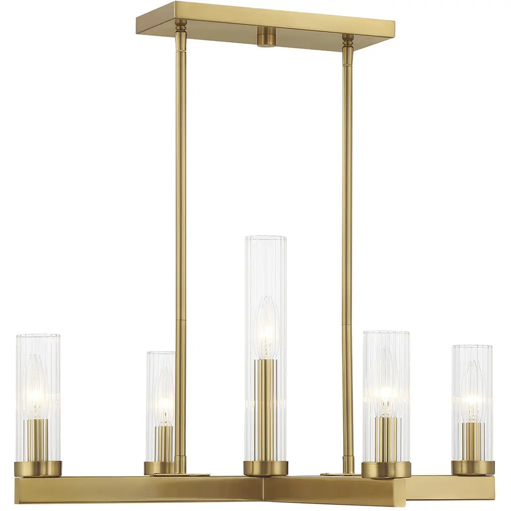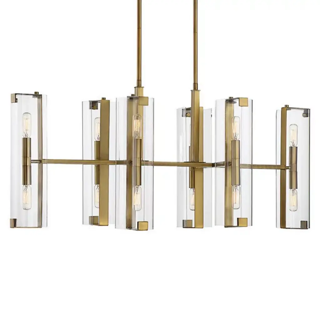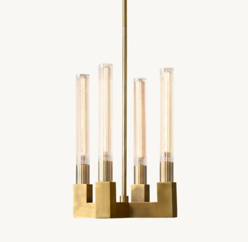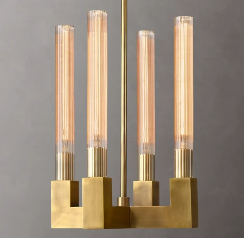 The form of a Beaux Arts chandelier is reinterpreted in solid brass by renowned lighting designer Jonathan Browning. Defined by clean lines and sharp angles, the fixture's elegant ribbed-glass hurricanes showcase Edison filament bulbs, shimmering like candles within.SHOP THE ENTIRE COLLECTION
