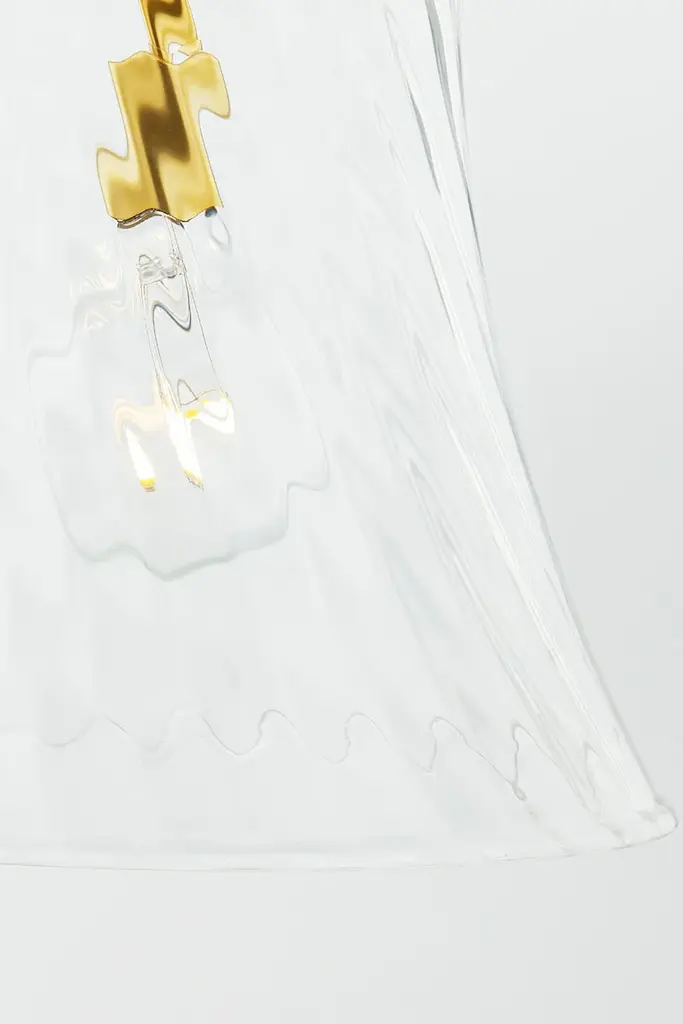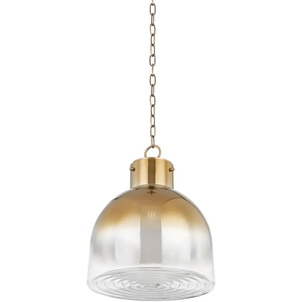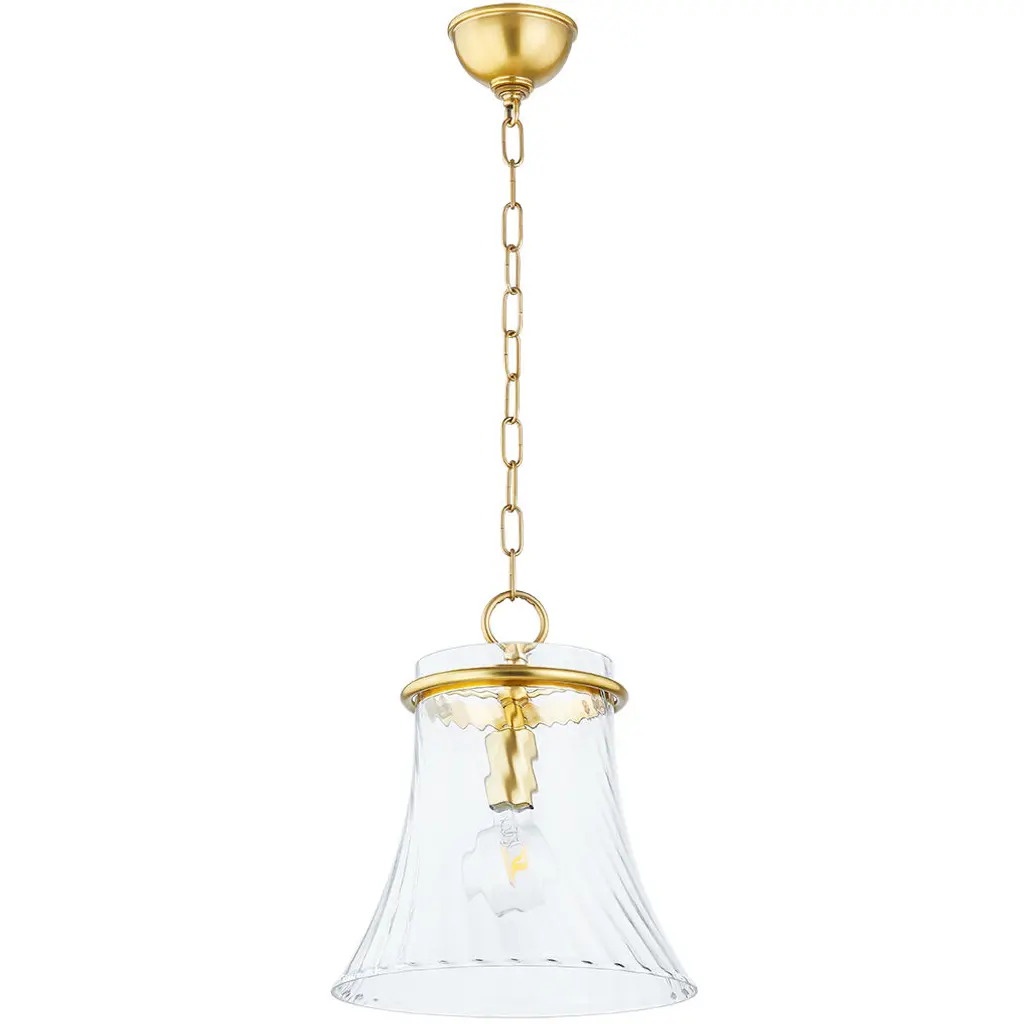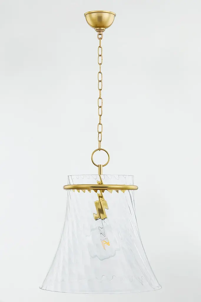 Cantana features a recognizable pendant silhouette in clear optic glass with a swirl pattern. The subtle lines in the swirled glass refract light and cast a soft glow when lit. A metal ring at the top in Aged Brass or Old Bronze draws the eye and adds a little shimmer. With both traditional and modern elements, this pendant is perfect in new traditional interiors.