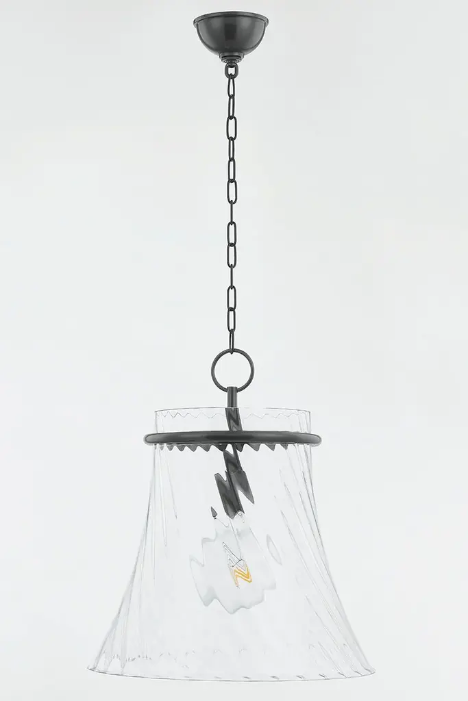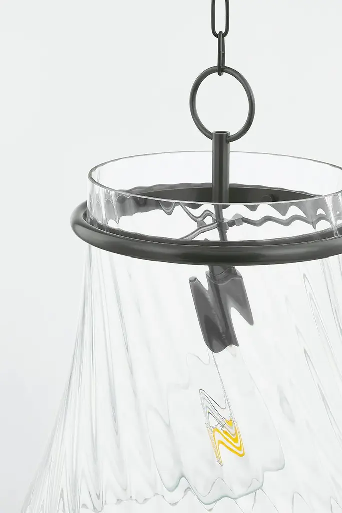 Cantana features a recognizable pendant silhouette in clear optic glass with a swirl pattern. The subtle lines in the swirled glass refract light and cast a soft glow when lit. A metal ring at the top in Aged Brass or Old Bronze draws the eye and adds a little shimmer. With both traditional and modern elements, this pendant is perfect in new traditional interiors.