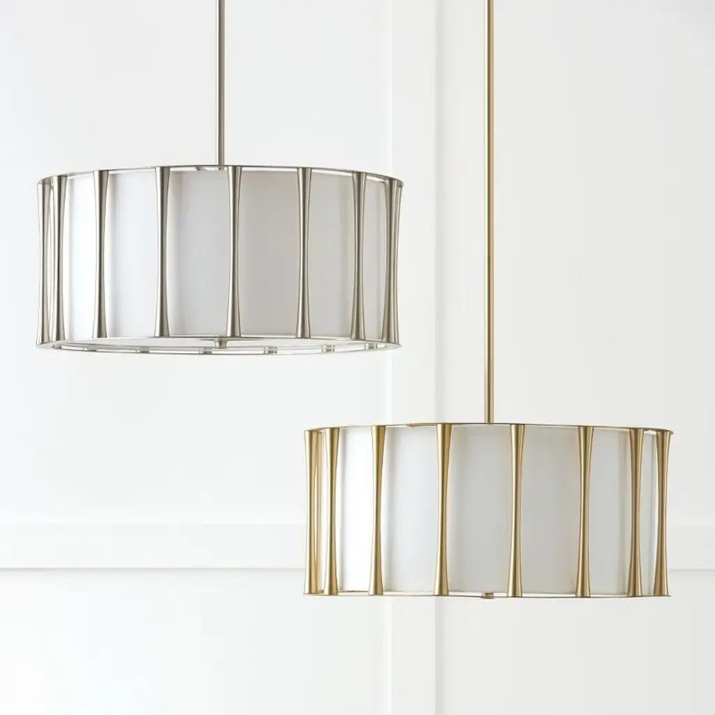 Soft and statement making, the Bodie Pendant adds a layerof luxury to any space. The tapered columns in Brushed Nickel frame the tailored fabric shade, creating a sophisticatedluminaireto matchyourstyle. DIMENSIONS: Overall: 24.5"W x 11"H; Adjustable Hanging Height: 18" - 63.5"; Includes 12" of chain and 120" of wire; Rods Included 6"(1), 12"(1) & 18"(1)L DETAILS: The tapered metal accents surround the white fabric drum shade and frosted acrylic diffuser. FINISH: With a soft, visual texture, the Brushed Nickel finish is a light-medium grey with slightly warm undertones. BULBS: Designed to be dimmable and LED/CFL/Incandescent bulb compatible, this fixture uses 4 - 100 Watt (max) E26 Medium base bulbs (not included). FEATURES: Rated for dry locations; includes a 1-Year Manufacturer Warranty. Mounting Direction: Horizontal Canopy Included: Yes Canopy Diameter: 5.00 Chain Length: 12.00 Rod Length(s): 1-6, 1-12, 1-18 Shade Included: Yes