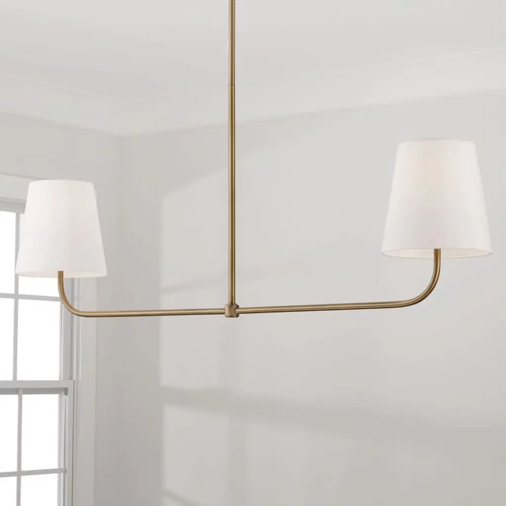 Embodying true minimalist form, the Brody Island brings sleek, simplified style in a linear pendant chandelier. The Matte Black finish enhances the classic look of the white fabric shades to deliver sophisticated, less-is-more design. DIMENSIONS: Overall: 50"W x 21.25"H x 9"E; Adjustable Hanging Height: 22" - 72"; Includes 12" Chain; 120" Wire and Rods Included 6"(1),12"(1) & 18"(1)L. DETAILS: Crisp fabric shades accents the minimalist silhouette for a sophisticated, simplified style. FINISH: Matte Black is a powder coated, muted, neutral tone. BULBS: Designed to be dimmable and LED/CFL/Incandescent bulb compatible, this fixture uses 2 - 100 Watt (max) E26 Medium base bulbs (not included). It's shown here with an A19 lamp. FEATURES: Rated for dry locations; includes a 1-Year Manufacturer Warranty.